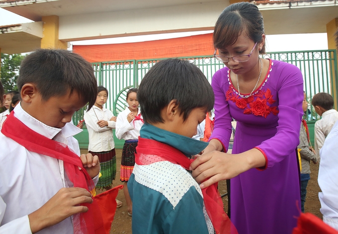 Cô giáo sửa khăn quàng đỏ cho học trò trước lễ chào cờ. |