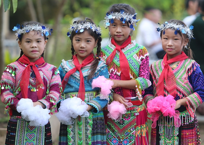 Những em học sinh người dân tộc Mông đứng sau sân khấu chuẩn bị cho tiết mục văn nghệ. |