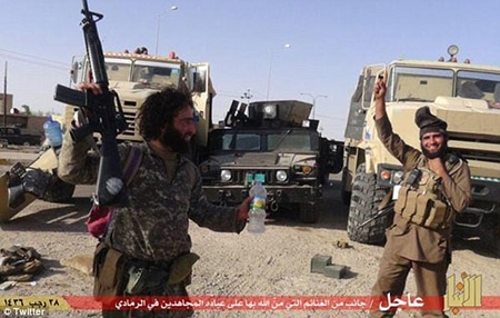 IS lục soát các xe quân sự của quân đội chính phủ sau khi kiểm soát thành phố Ramadi hôm 17/5. Ảnh: Daily MailVideoIS tấn công thành phố của Iraq, quân đội tháo chạy |