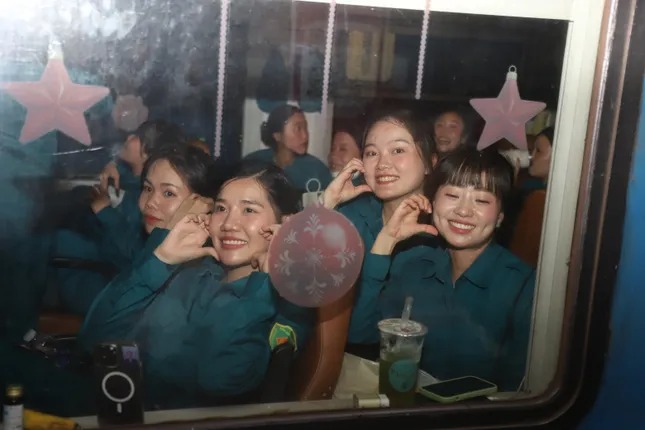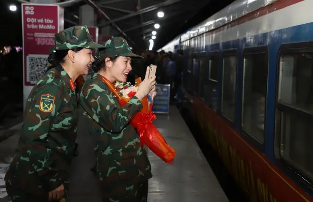 Các nữ quân nhân chào hỏi, chụp ảnh kỷ niệm trước giờ hành quân trên chuyến tàu ra Bắc.