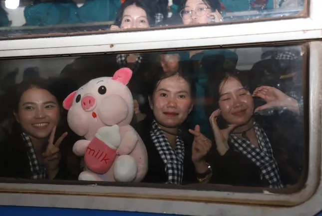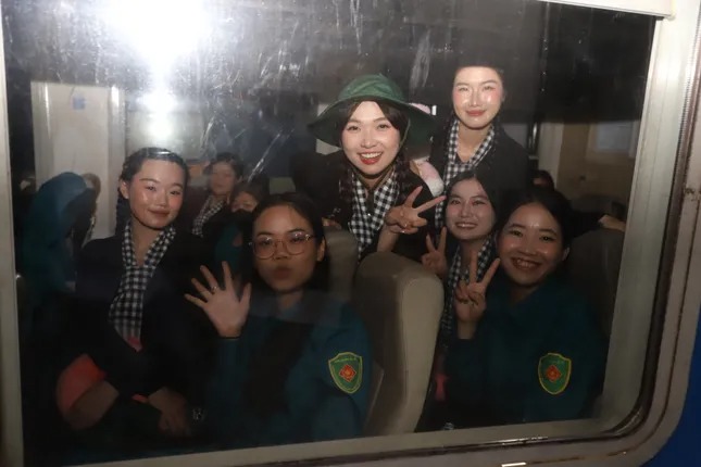 Các cô gái chụp ảnh lưu niệm trước giờ đi tàu ra Thủ đô Hà Nội.