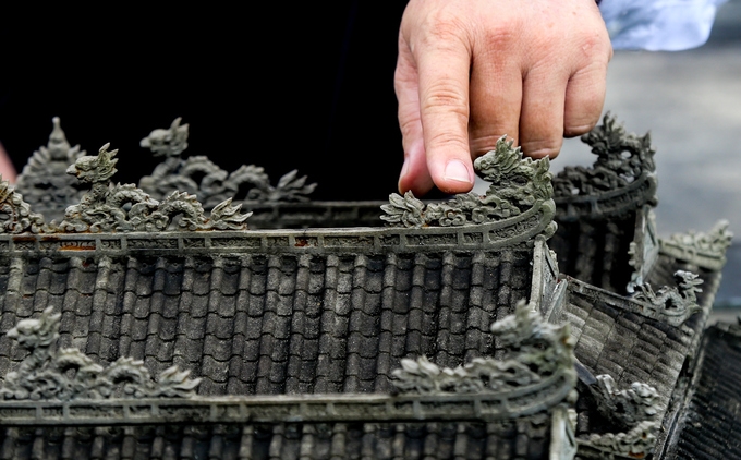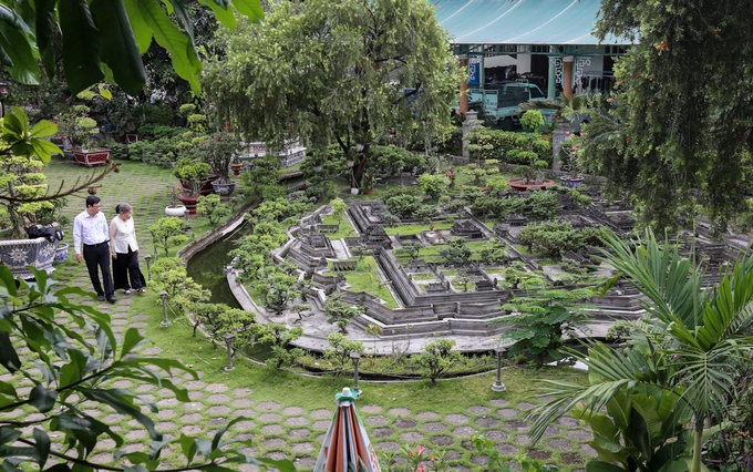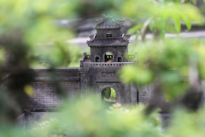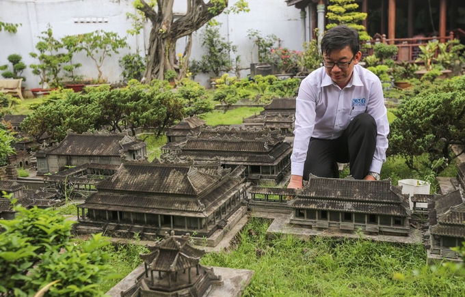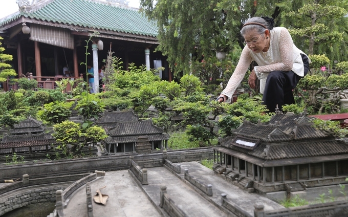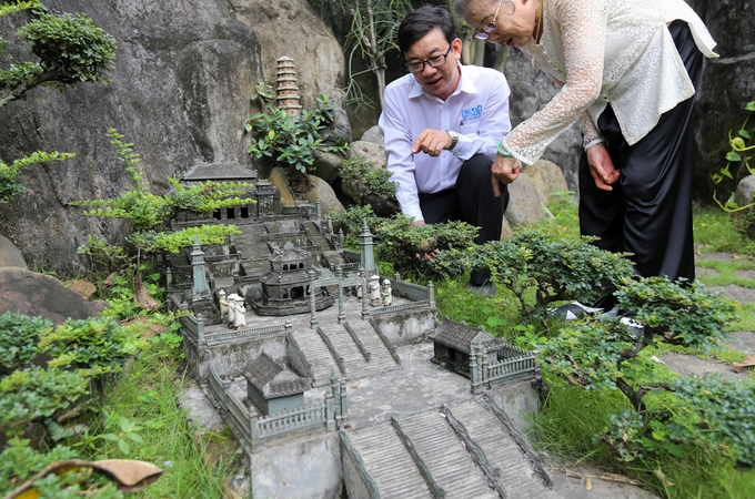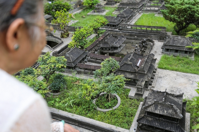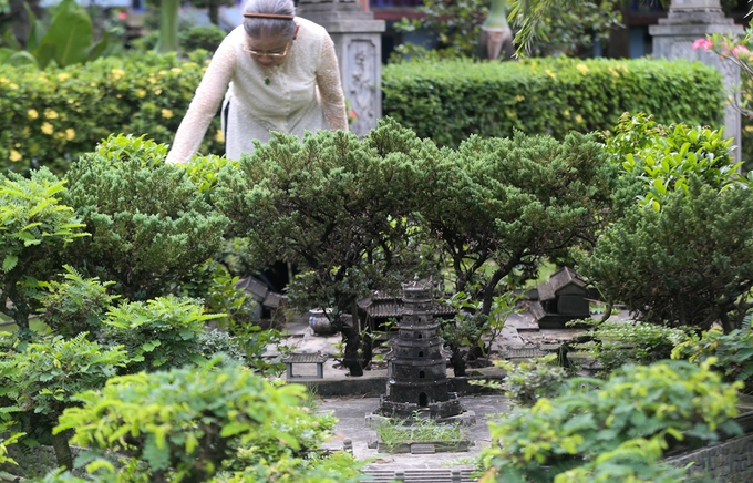 Hình ảnh chùa Thiên Mụ với tháp Phước Duyên cao bảy tầng được thu nhỏ dưới những tán cây. Mỗi khi rảnh, hai mẹ con ông Tùng lại chăm chút tỉa từng nhành cây, lau chùi bụi, tu sửa những kiến trúc bị hư hỏng... "Tôi hy vọng công trình có thể bền vững được trăm năm để thế hệ mai sau có nguồn tư liệu nghiên cứu, học hỏi", ông Tùng tâm sự. |