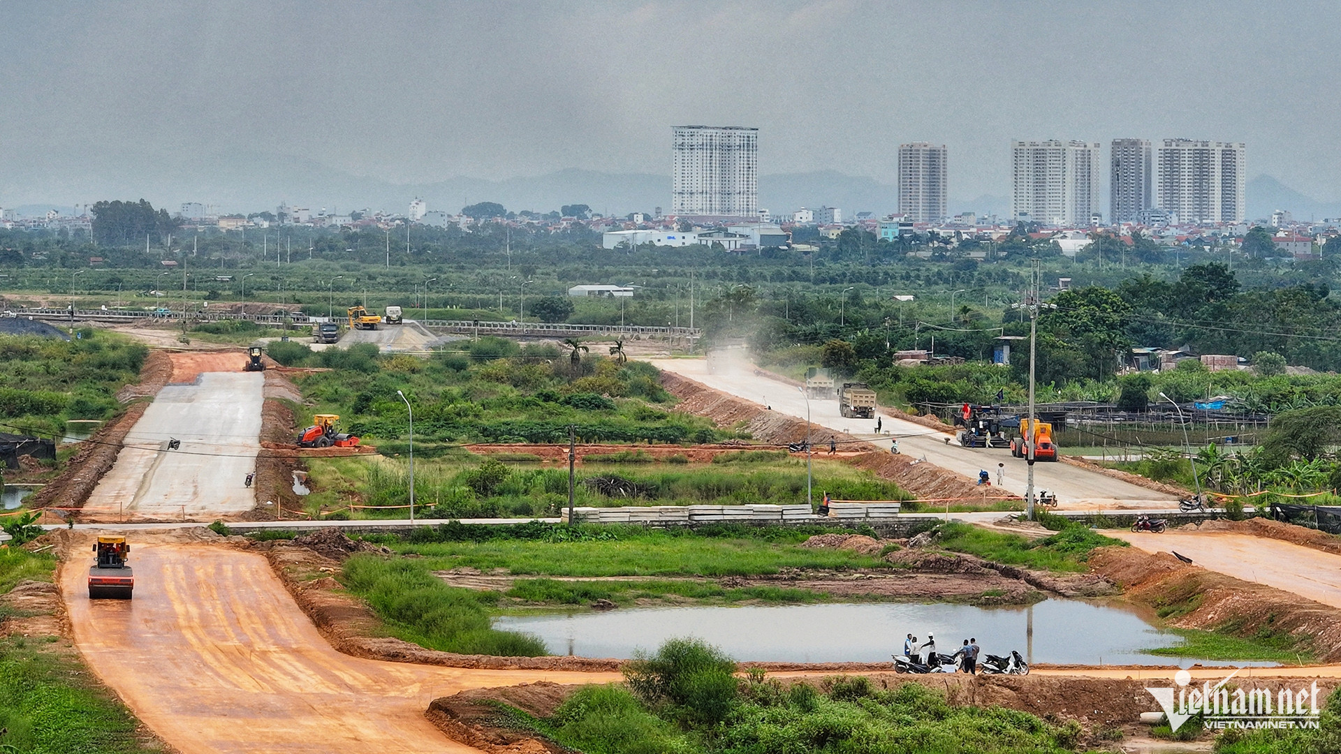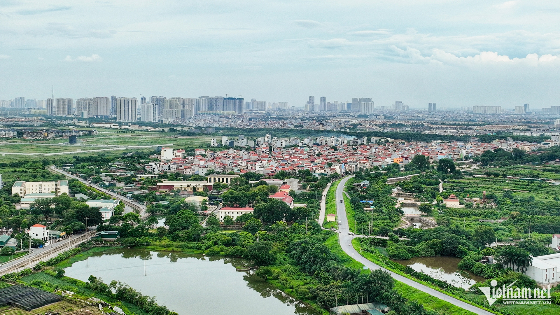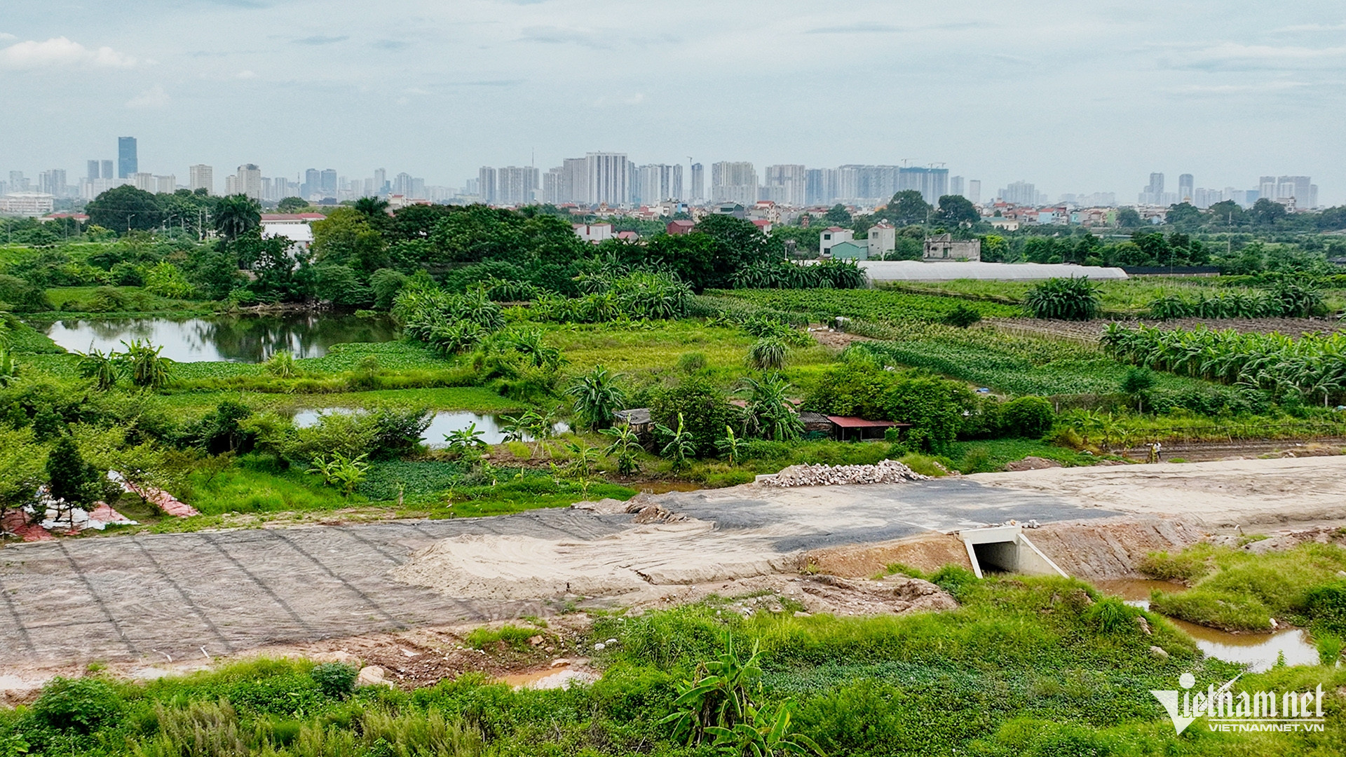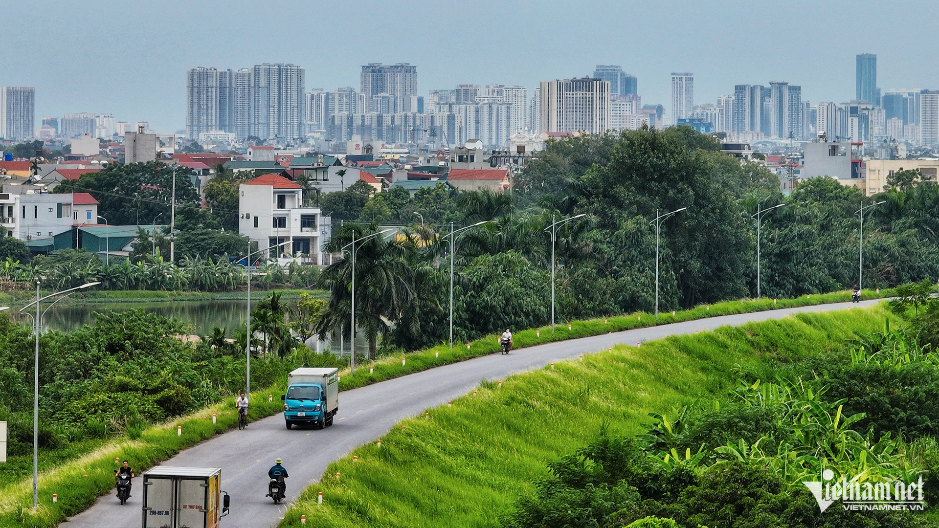 Từ đường Vành đai 4 có thể nhìn thấy các cao ốc, chung cư ở trung tâm Thủ đô không xa. Khoảng cách từ đây lưu thông về quận gần nhất là 20km, đi trên đại lộ Thăng Long.