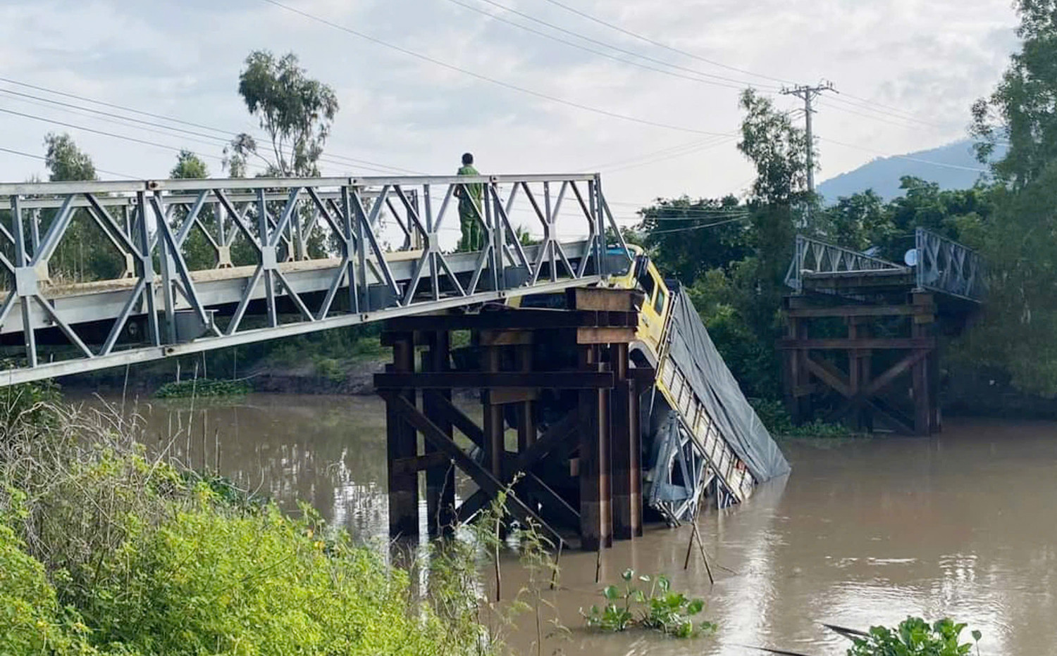| Hiện trường vụ sập cầu ở An Giang: Tải trọng cầu chỉ 5 tấn, xe tải chở đến... 30 tấn gạch lao qua |