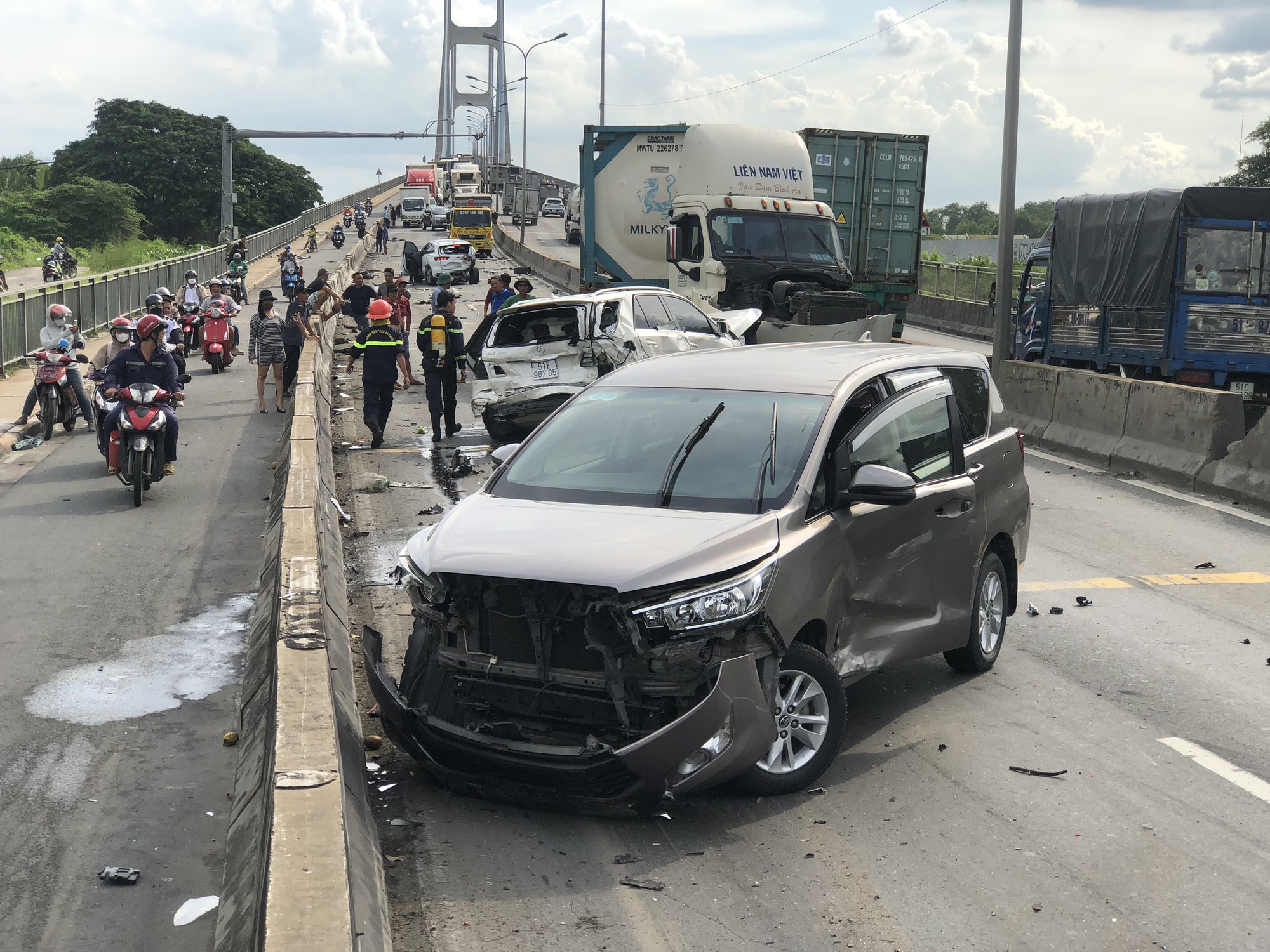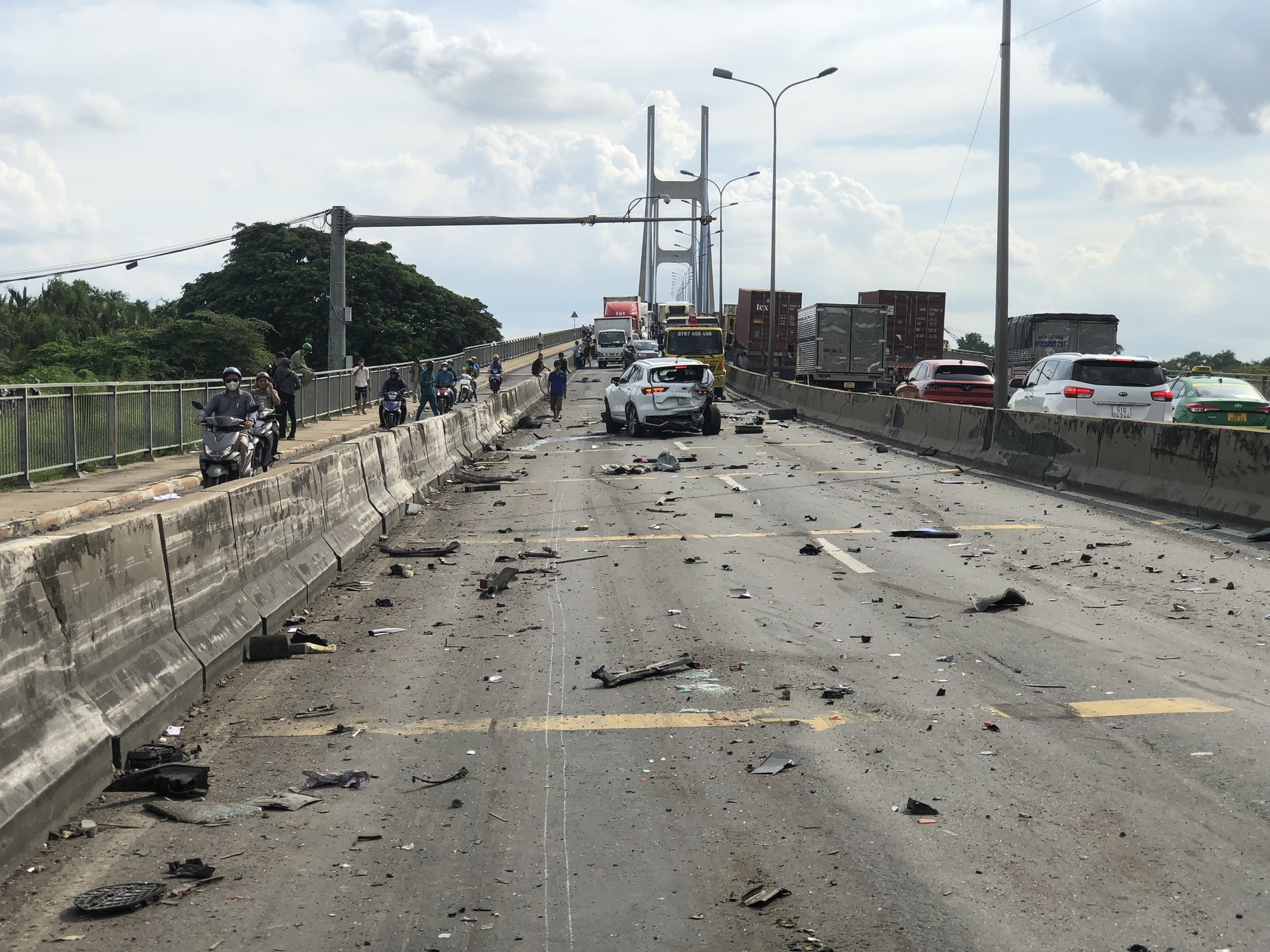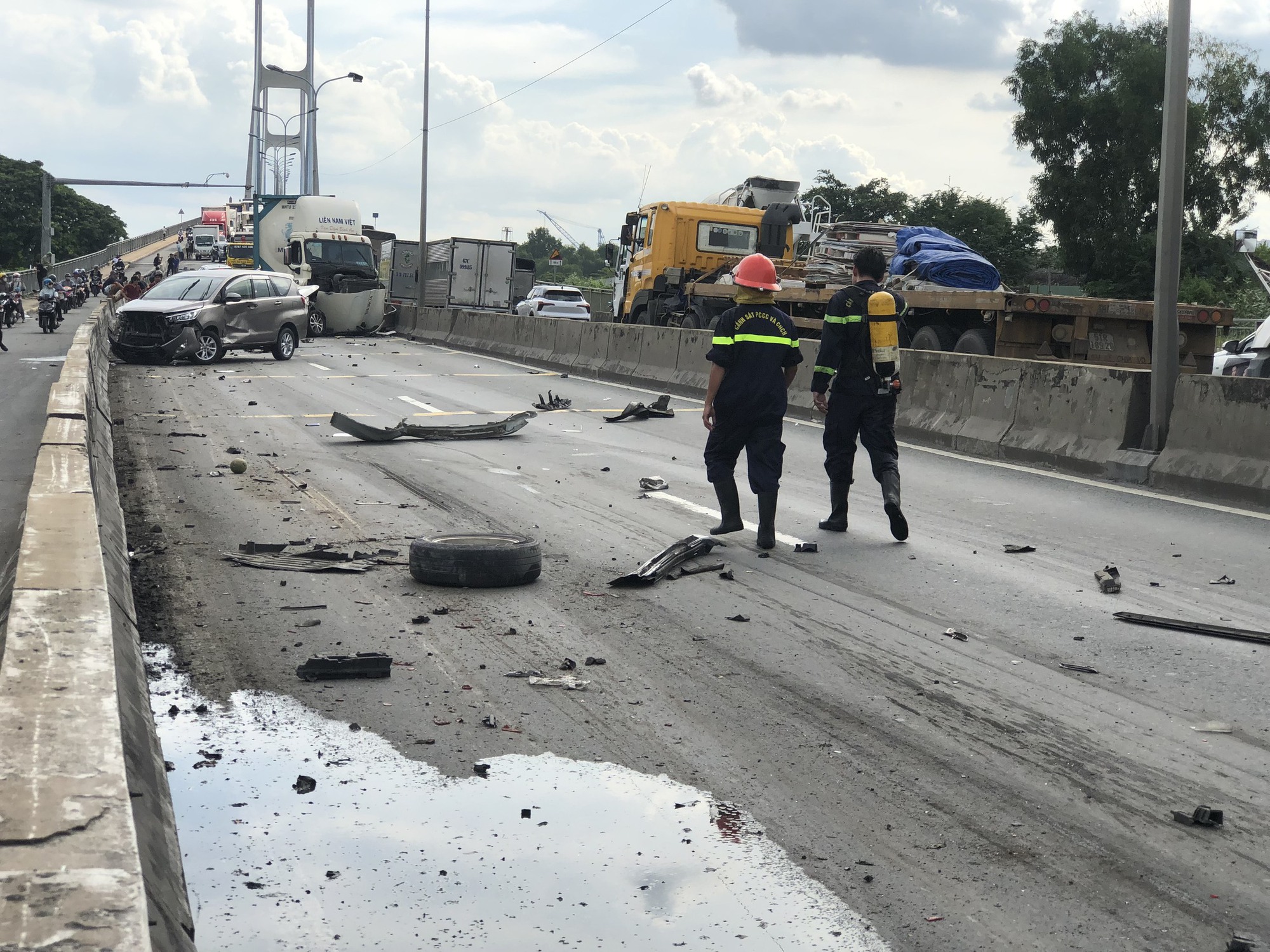 Sau tai nạn liên hoàn giữa 8 phương tiện, 2 ô tô con và 1 xe tải bị bốc cháy ngùn ngụt. Vụ tai nạn đã gây kẹt xe kéo dài trên cầu Phú Mỹ.