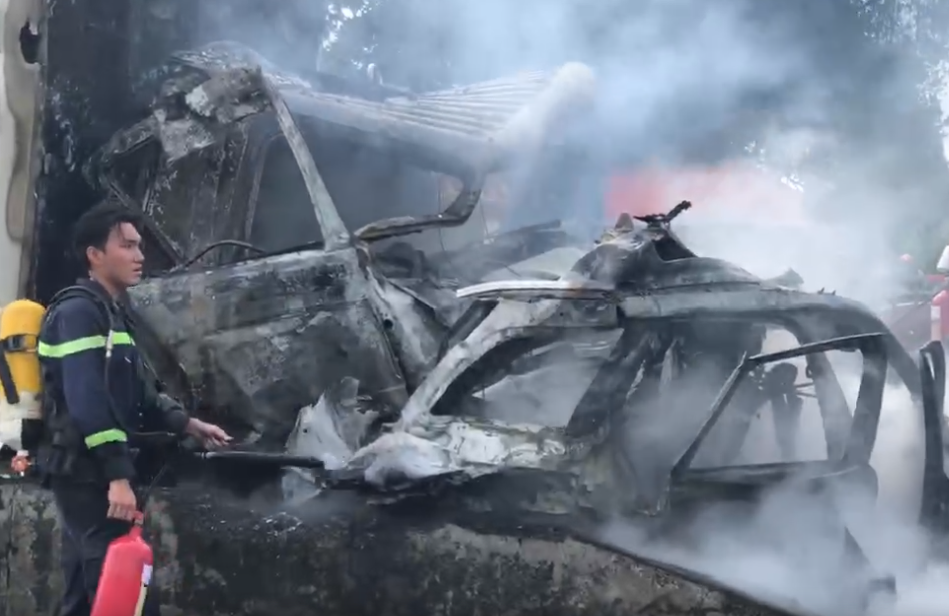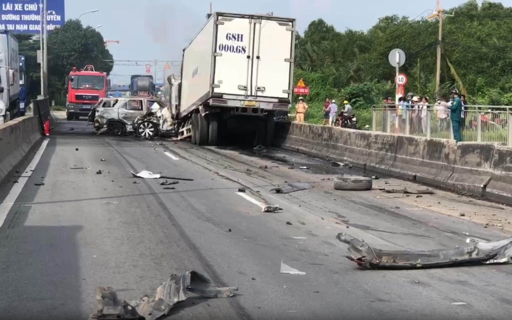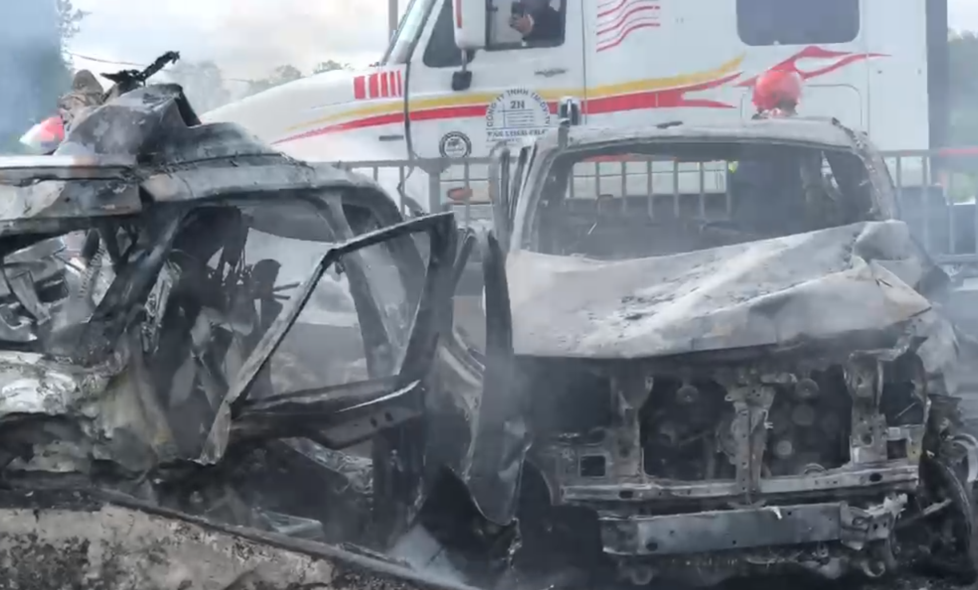 Sau tai nạn liên hoàn giữa 8 phương tiện, 2 ô tô con và 1 xe tải bị bốc cháy ngùn ngụt. Vụ tai nạn đã gây kẹt xe kéo dài trên cầu Phú Mỹ.