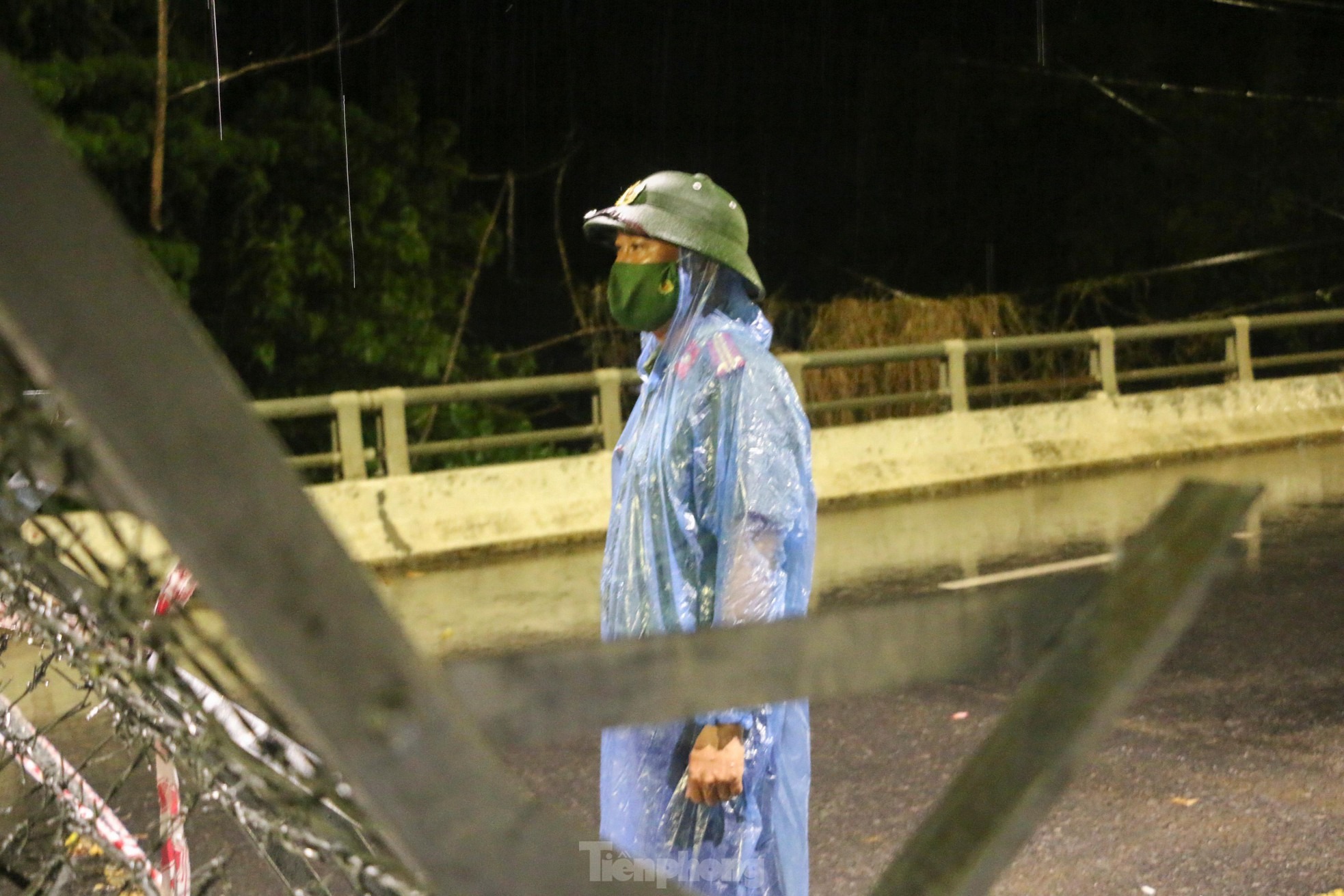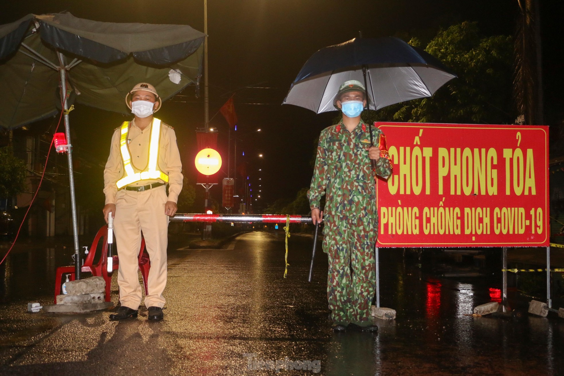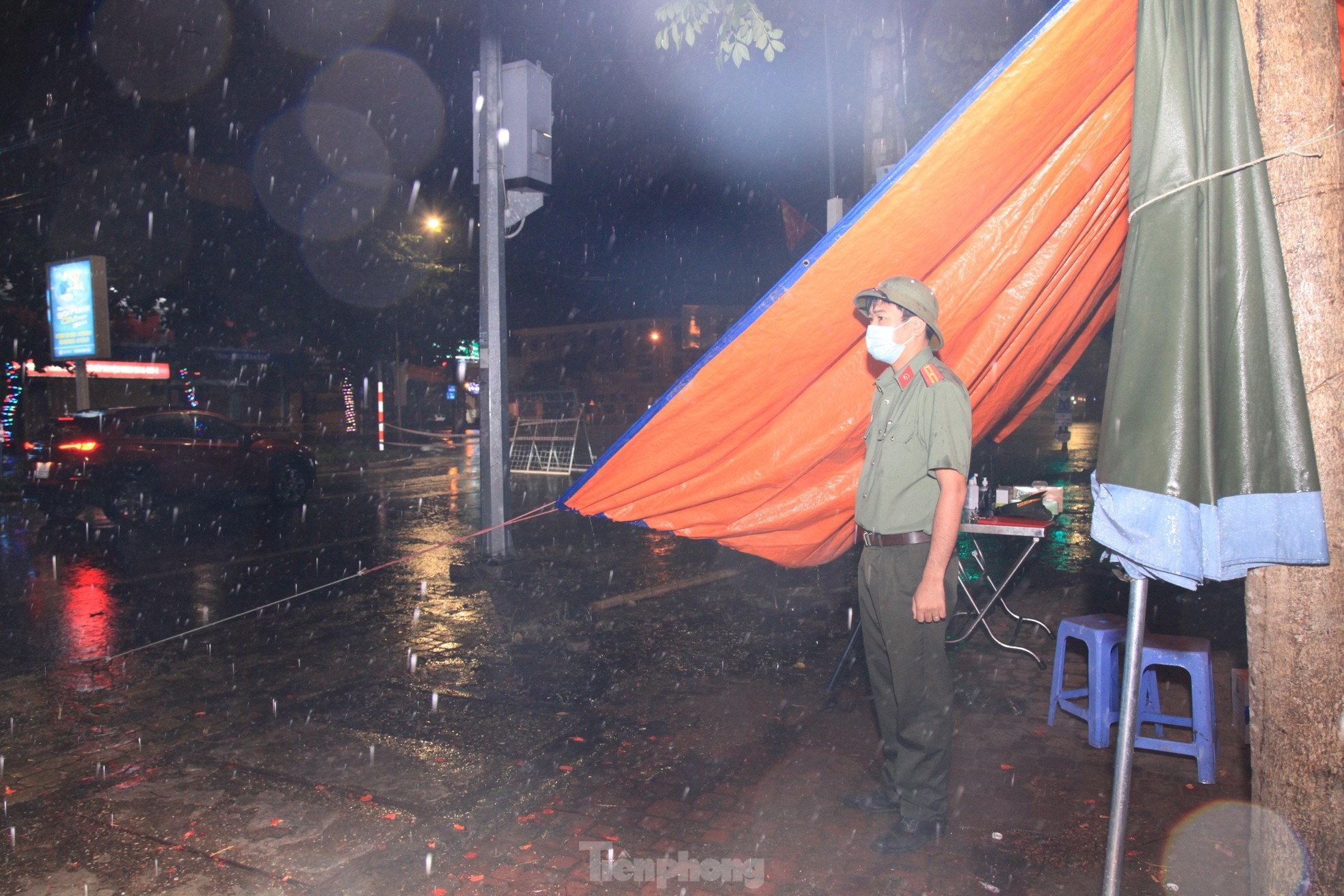 Những trận mưa lớn trút xuống trong đêm khiến công tác phòng chống dịch COVID-19 trở nên vất vả, khó khăn. Trên đường phố, khi mọi người đang ngon giấc, các chiến sỹ trực chốt vẫn miệt mài làm nhiệm vụ.