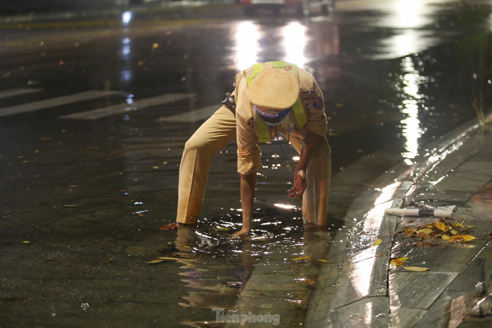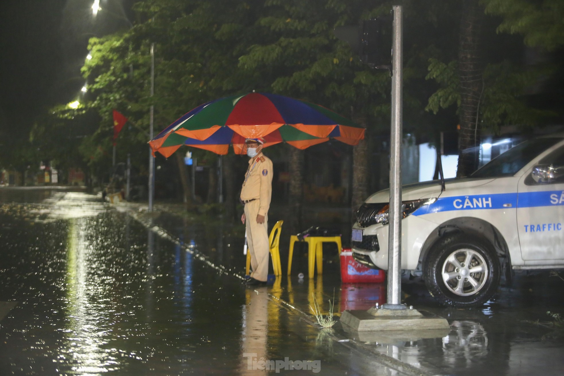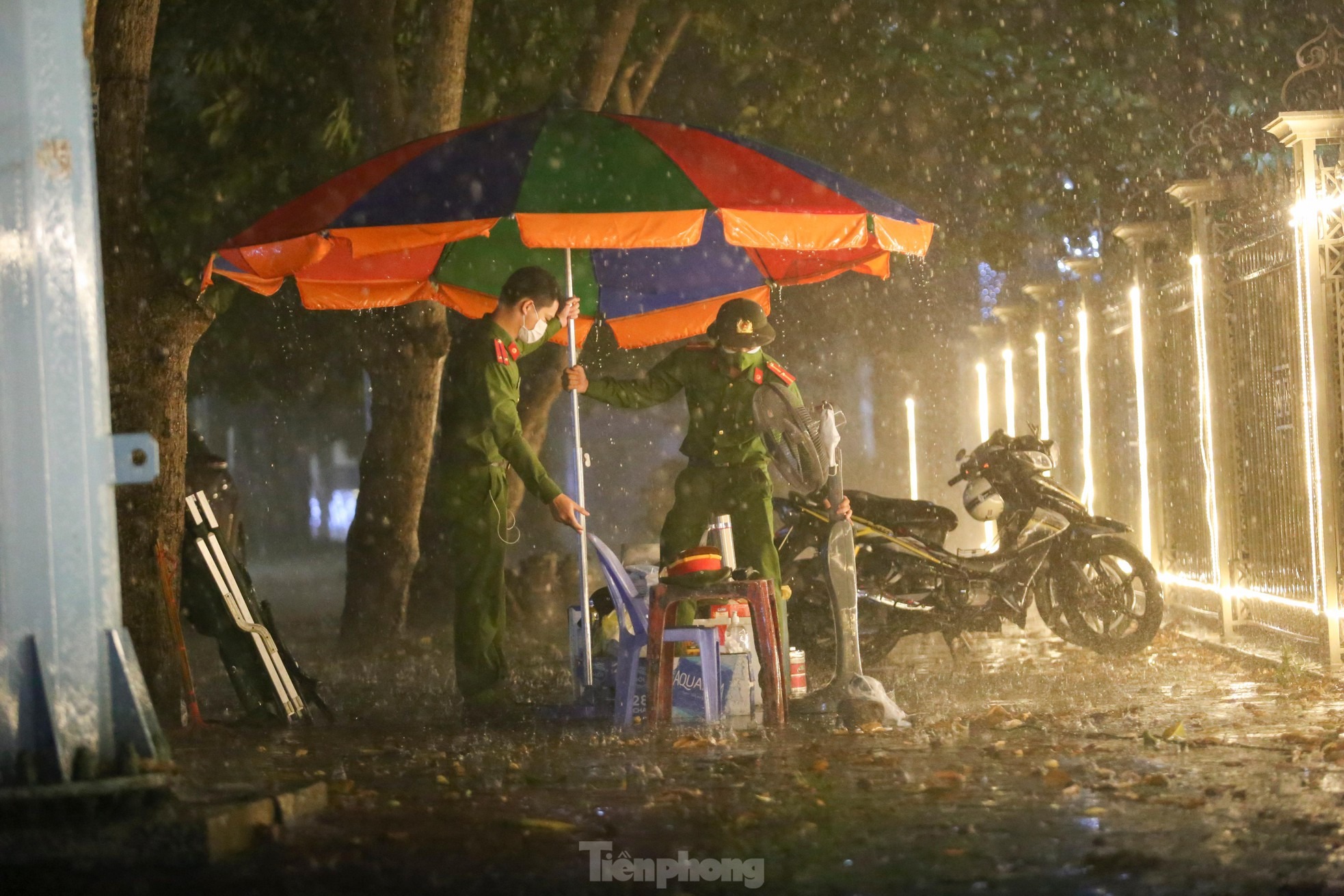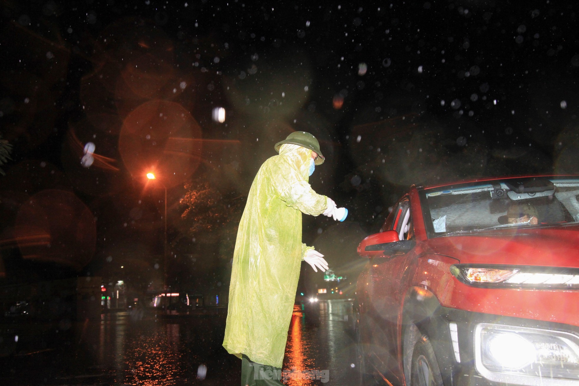 Những trận mưa lớn trút xuống trong đêm khiến công tác phòng chống dịch COVID-19 trở nên vất vả, khó khăn. Trên đường phố, khi mọi người đang ngon giấc, các chiến sỹ trực chốt vẫn miệt mài làm nhiệm vụ.