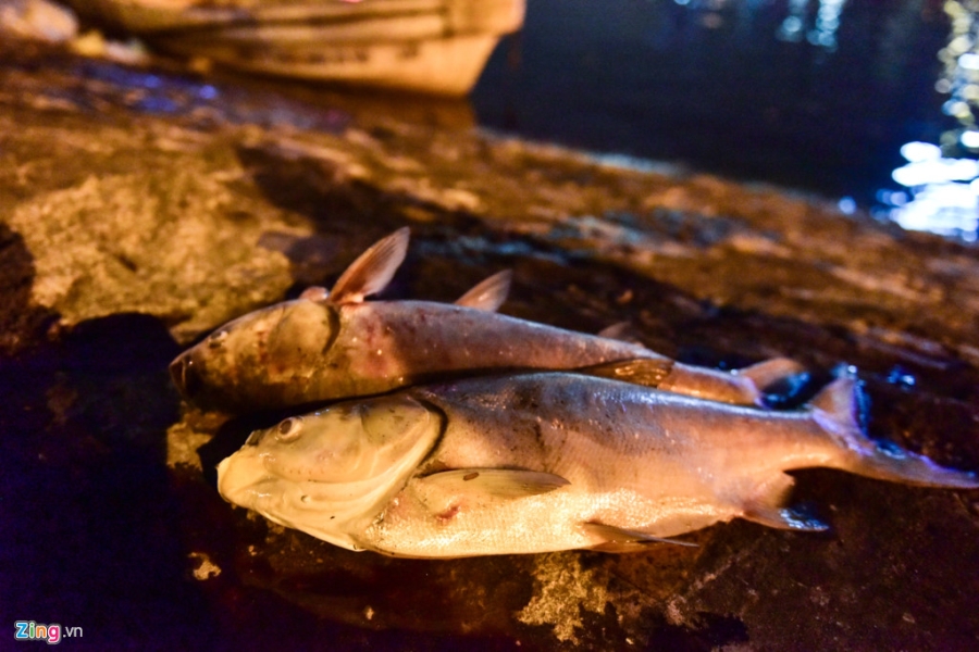 | Công việc được tiến hành từ chiều ngày 8/6. Tuy nhiên, lượng cá chết khá nhiều nên công nhân phải làm liên tục đến 0h ngày 9/6 vẫn chưa xong. |