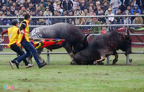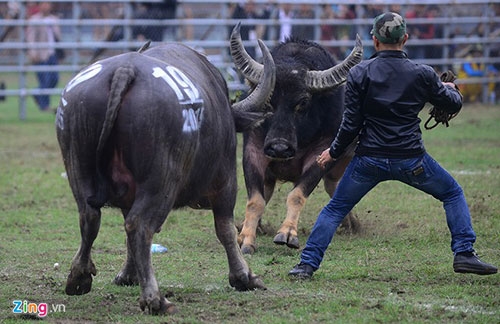 Pha nguy hiểm khi thợ bắt trâu dồn ép hai "ông trâu" thi đấu hăng hái hơn. |