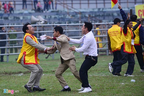 Có người tránh trâu chạy bị ngã, suýt bị trâu lao vào người. Trong ảnh, trâu số 17 (Vĩnh Phúc) bại trận và chạy khắp sân khiến lực lượng bắt trâu vất vả. |