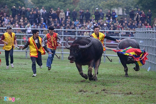Những thợ bắt trâu chuyên nghiệp tại hội chọi trâu Bắc Ninh vất vả mới khống chế được các chú trâu to khỏe. |