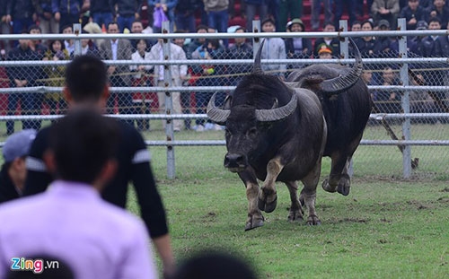 Trâu số 07 được mua từ Thượng Hải (Trung Quốc) dồn ép trâu số 9 (Bắc Ninh) chạy vòng quanh sân. Nhiều con nhằm thẳng lực lượng bắt trâu để lao vào... |