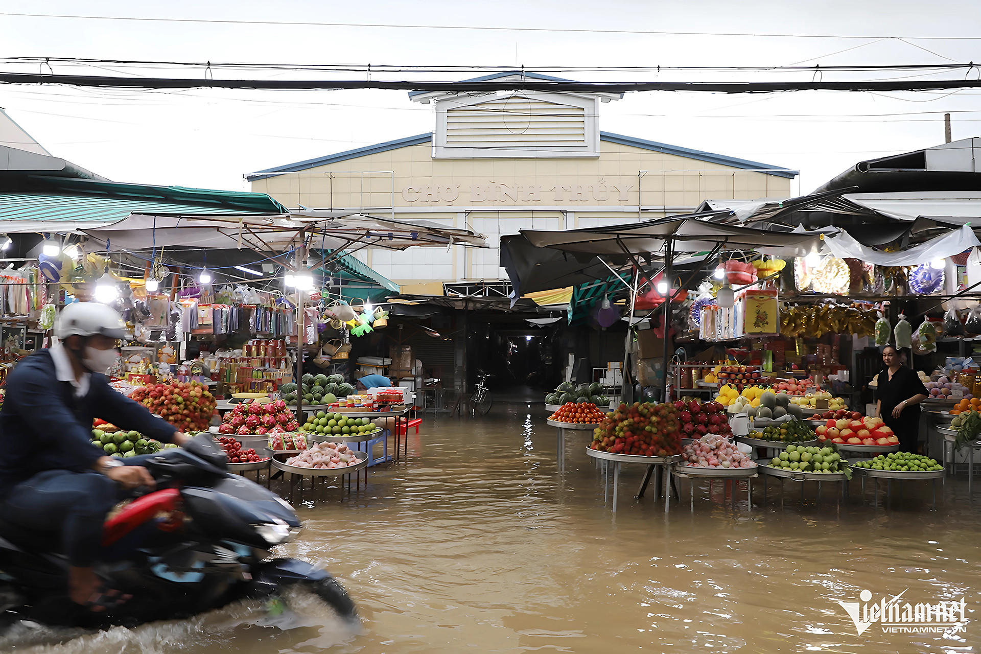 Triều cường vượt mức báo động 3 gây ngập sâu tại một số tuyến đường tại TP Cần Thơ, người dân phải chèo xuồng đưa con trở về nhà.