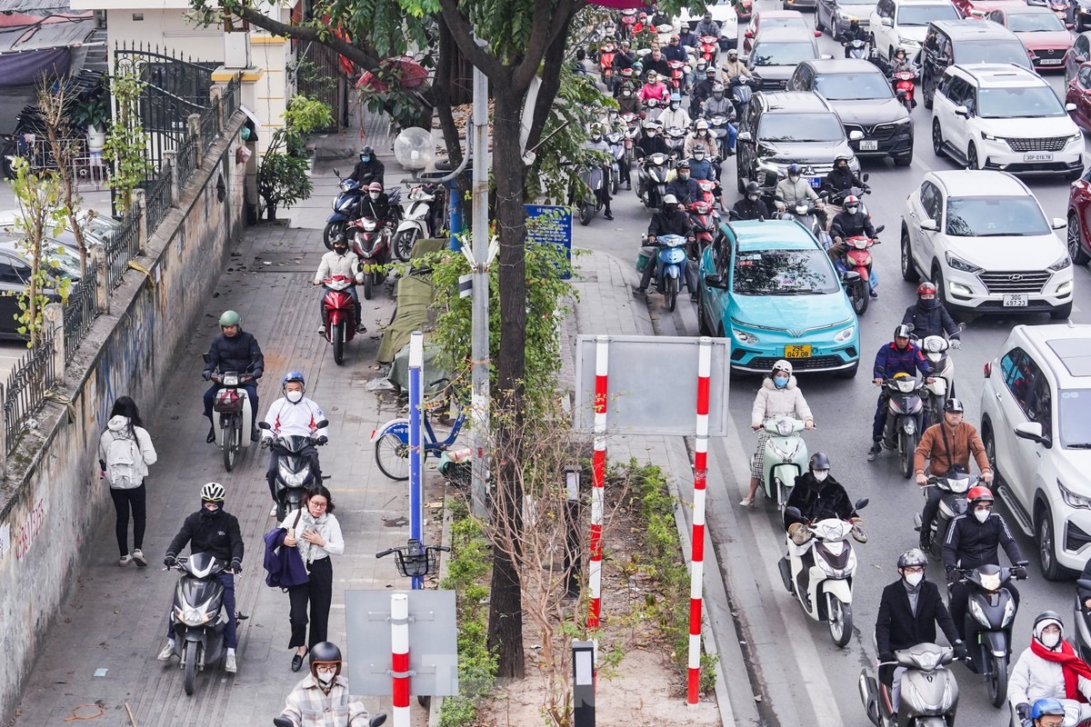 Nhiều xe máy trên đường Nguyễn Chí Thanh leo lên vỉa hè, gây ảnh hưởng đến người đi bộ.
