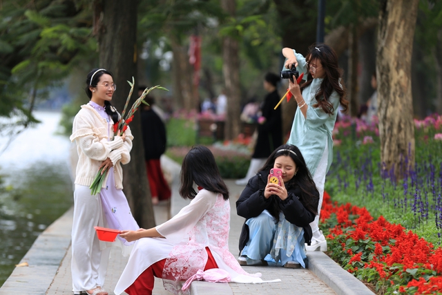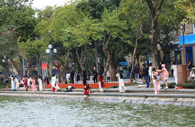 12/01/2025 01:15Trời rét đậm 10 độ C, nhiều 'nàng thơ' vẫn thướt tha áo dài chụp ảnh Tết trên phố đi bộ Hồ Gươm