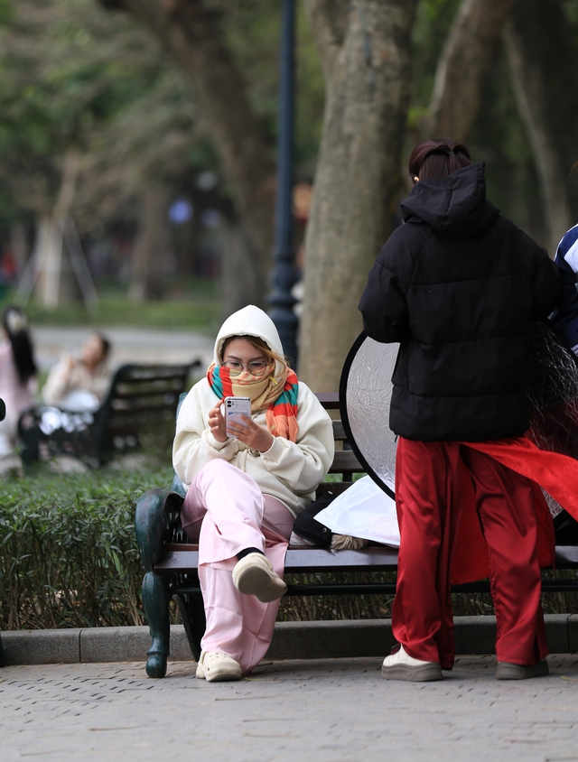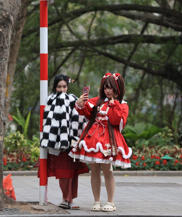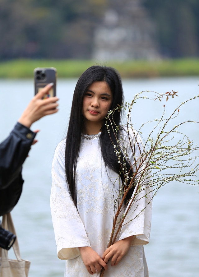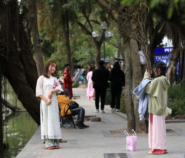 Đáng chú ý, mặc dù trời rét đậm nhưng vẫn có rất nhiều "nàng thơ" mặc trang phục áo dài lên phố đi bộ Hồ Gươm để chụp ảnh.