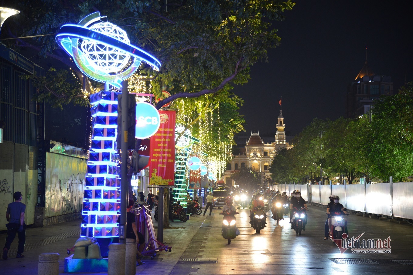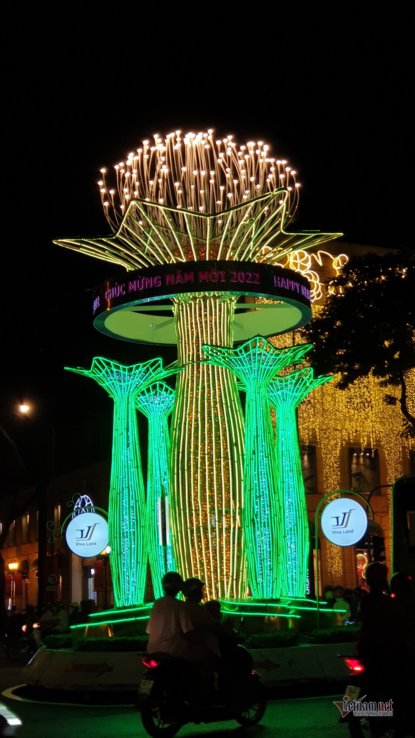 Những ngày cận Tết Nhâm Dần 2022, các tuyến đường trung tâm quận 1 như Nam Kỳ Khởi Nghĩa, Lê Duẩn, Đồng Khởi, Nguyễn Huệ, Hàm Nghi… đèn đường bật sáng. Những họa tiết như hoa mai vàng, hoa đào rực rỡ khoe sắc.