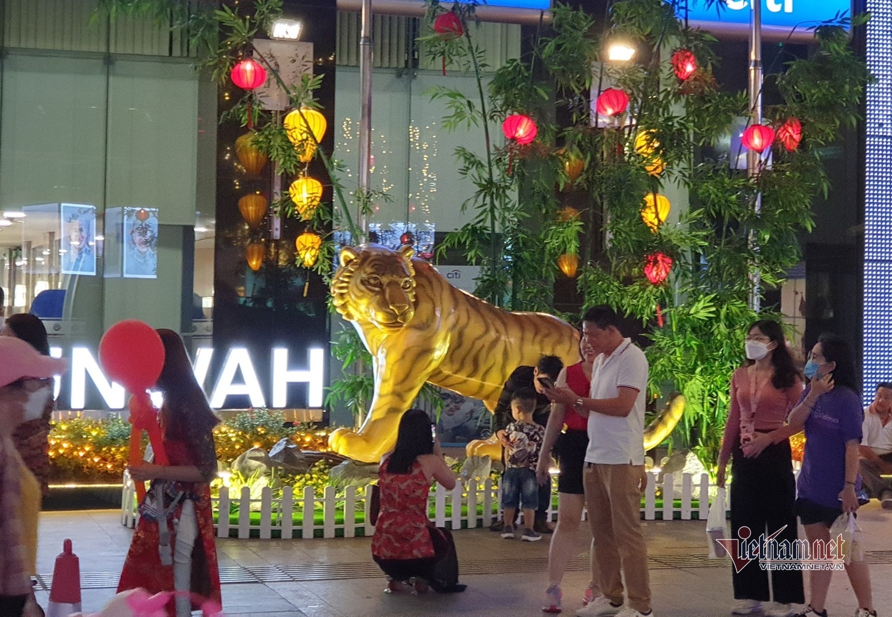 Các trung tâm thương mại cũng được trang trí các họa tiết chào đón năm mới 2022, trong đó hình những chú hổ dũng mãnh thu hút người dân đến xem, chụp hình.