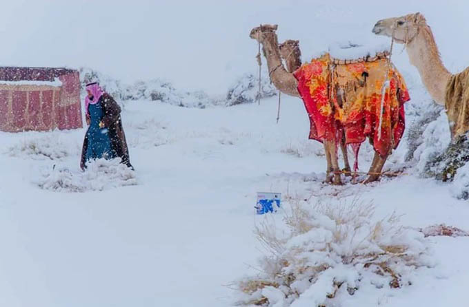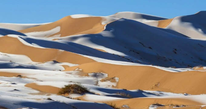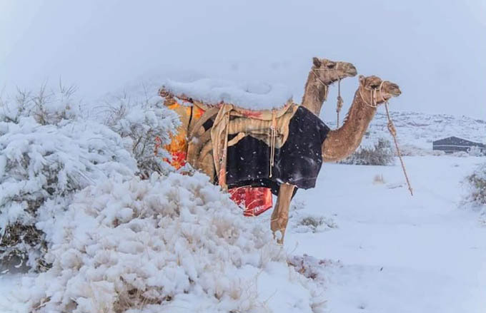 Sa mạc Sahara ở châu Phi và vài khu vực ở Saudi Arabia bị tuyết trắng bao phủ sau khi nhiệt độ đột nhiên giảm sâu chỉ còn âm 2 độ C.