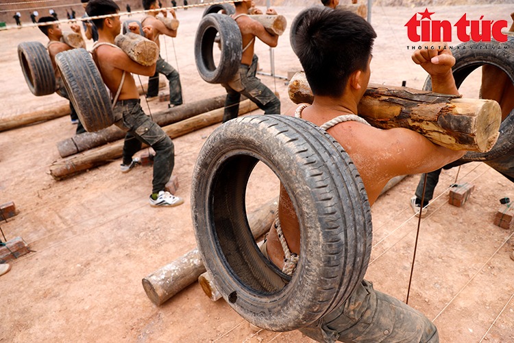 Để có cơ thể dẻo dai, bền bỉ, các chiến sĩ phải trải qua nhiều bài tập rèn thể lực khắc nghiệt như vác gỗ nặng, vần lốp xe to nặng lên dốc, đẩy tạ...