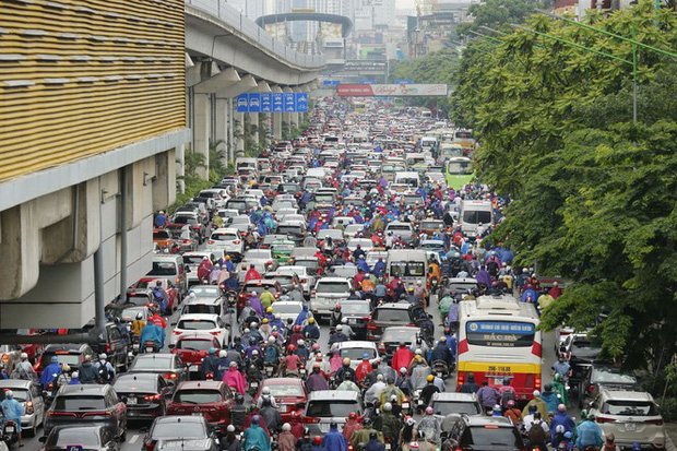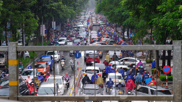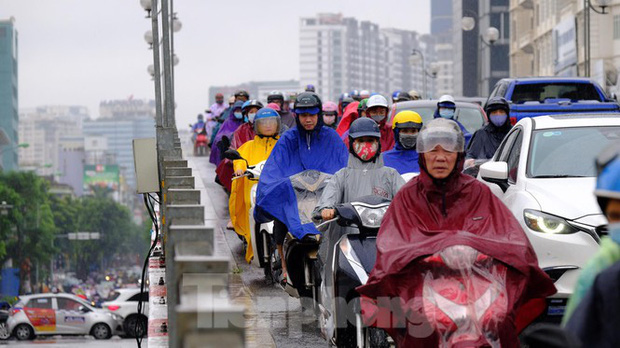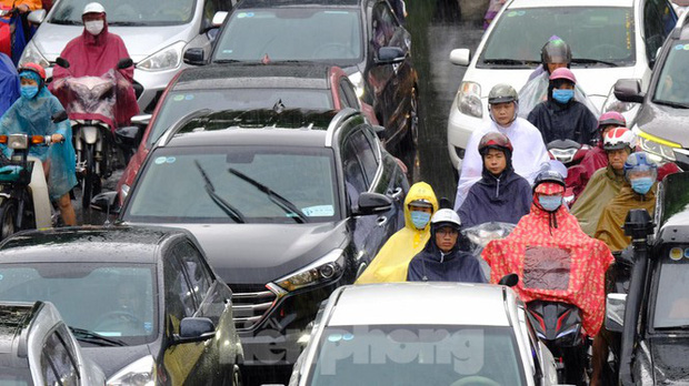 Cơn mưa đúng vào giờ cao điểm buổi sáng khiến nhiều tuyến đường ở Hà Nội rơi vào cảnh ùn tắc nghiêm trọng. Người dân vật vã vượt biển xe cộ để tới công sở.