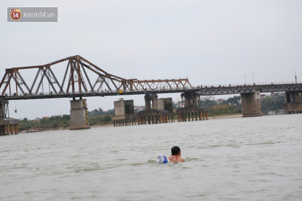 Trước tình trạng nền nhiệt giảm sâu như hiện nay, một số người đàn ông tại Thủ đô Hà Nội vẫn ra giữa sông Hồng, đoạn chân cầu Long Biên để tắm "tiên", bất chấp cái lạnh thấu xương này.