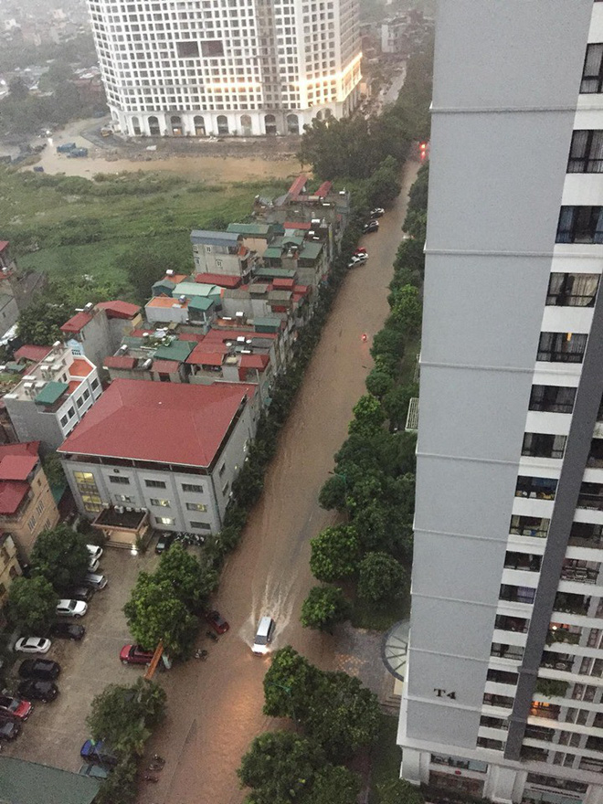 Vào khoảng gần 7h sáng, tại khu vực Times City, quận Hải Bà Trưng, ô tô phải đèn pha để di chuyển vì trời khá tối. Đường phố biến thành... sông từ lúc nào.