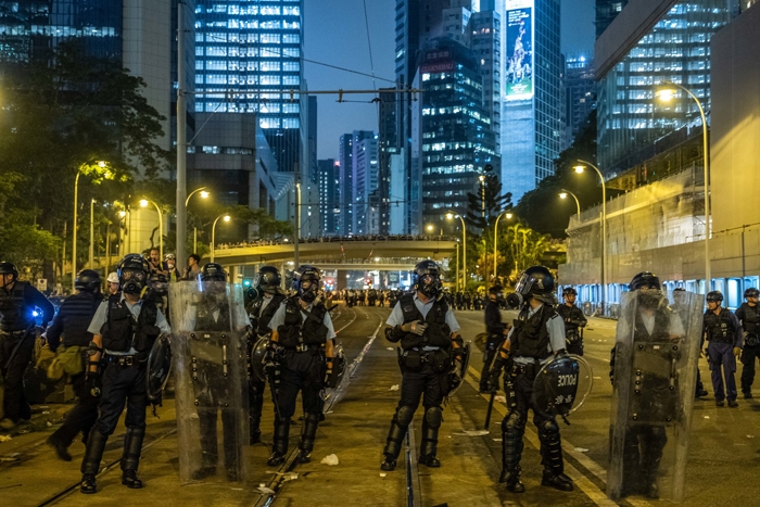 Cảnh sát Hong Kong dừng nghỉ ngơi trên một tuyến phố tối 12/6 sau những cuộc đụng độ bạo lực với người biểu tình.