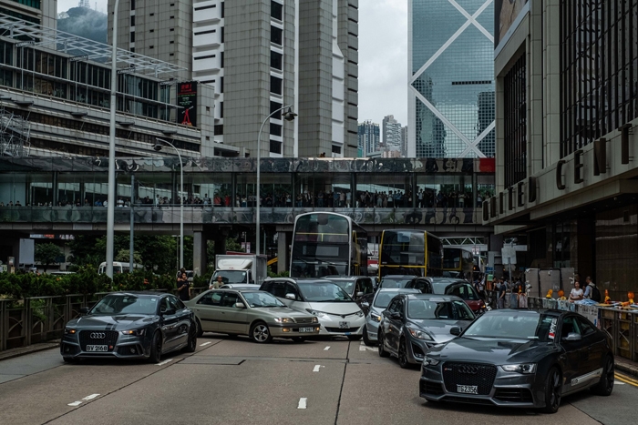Người biểu tình đỗ xe chặn lối vào trụ sở Hội đồng Lập pháp sáng 12/6. Dòng người biểu tình từ sáng sớm đã phong tỏa các con đường huyết mạch quanh trụ sở Hội đồng Lập pháp, khiến các nghị sĩ không thể tới được phòng họp.