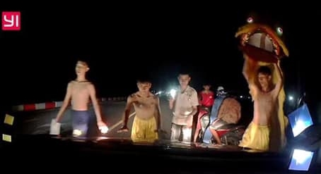 Đoạn clip ghi lại cảnh tượng nguy hiểm trên cầu Mây, huyện Kinh Môn, Hải Dương. Nhóm thiếu niên khoảng 6 cậu bé bất ngờ xuất hiện giữa đường khiến tài xế ô tô phải dừng lại. Nhóm này chia nhau, kẻ đứng múa lân, kẻ gõ trống, soi đèn nhằm xin tiền các tài xế. Phía trước chiếc ô tô, một xe máy cũng đang bị chặn đường.