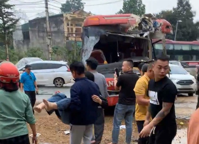 Cú va chạm mạnh khiến xe khách bị dập nát phần đầu, nhiều người đi trên xe khách văng xuống đường bị thương. Tại hiện trường, mảnh vỡ của 2 xe vương vãi khắp nơi, nhiều người bị thương được đưa ra khỏi xe khách. Được biết, vào thời điểm xảy ra tai nạn trời mưa, đường trơn, trên đường có nhiều phương tiện đang lưu thông.