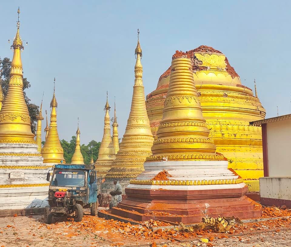 | Đỉnh chùa Shwe Sar Yan của Myanmar, ở phía đông nam Mandalay, đã sụp đổ sau một trận động đất lớn. |