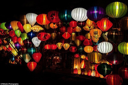 Đèn lồng nhiều màu sắc rực sáng trong đêm ở phố cổ Hội An. |