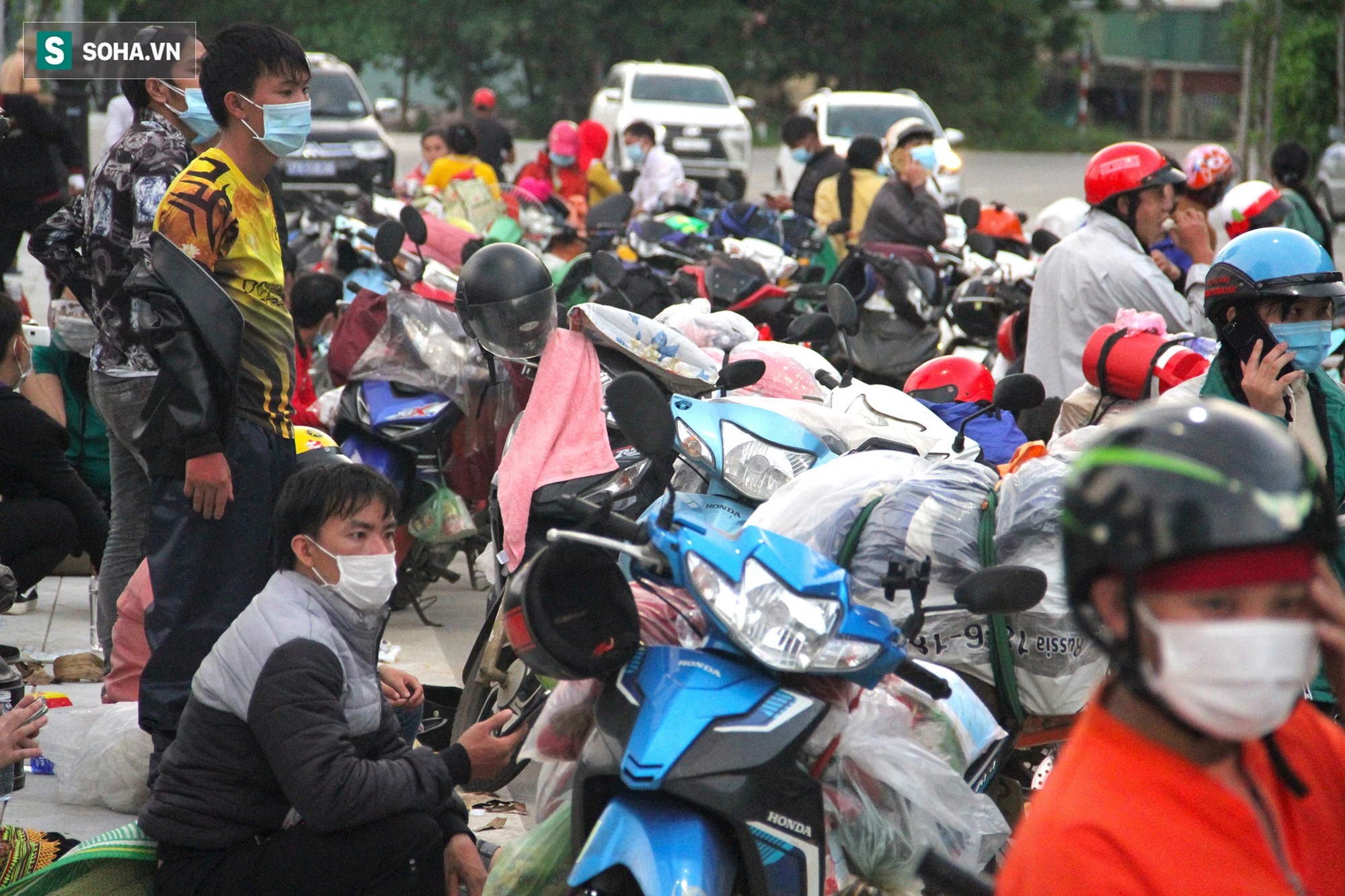 Chiều muộn 4/10, từng đoàn với hàng trăm người dân đi xe máy về đến khu vực cầu Bến Thủy (TP. Vinh, Nghệ An). Đây là những người dân đi xe máy từ các tỉnh phía Nam trở về quê hương để tránh dịch Covid-19.