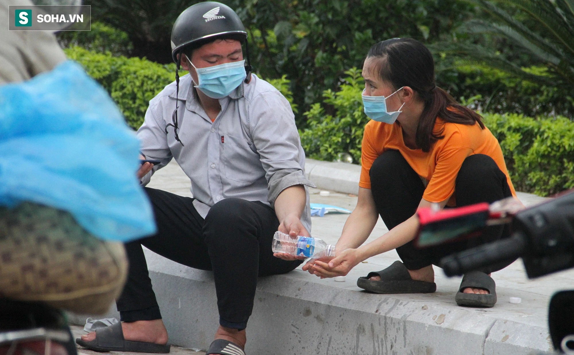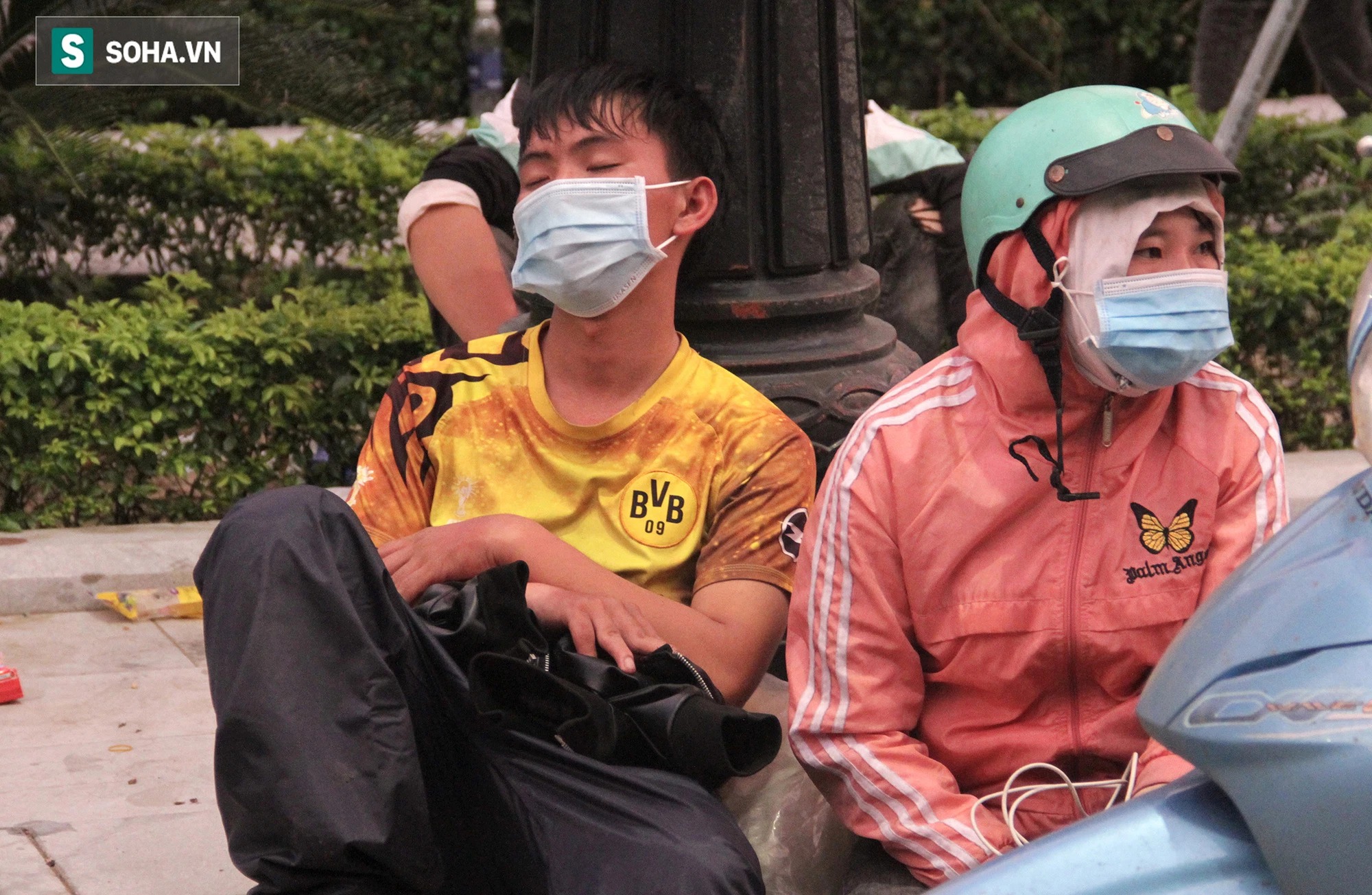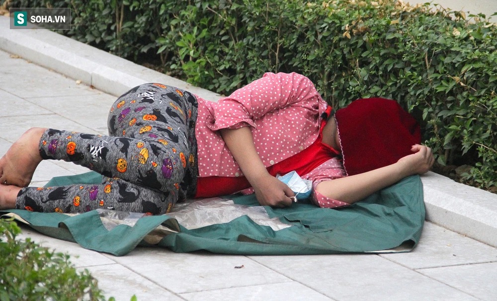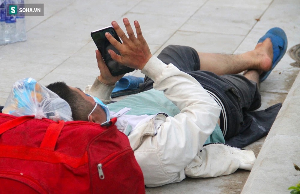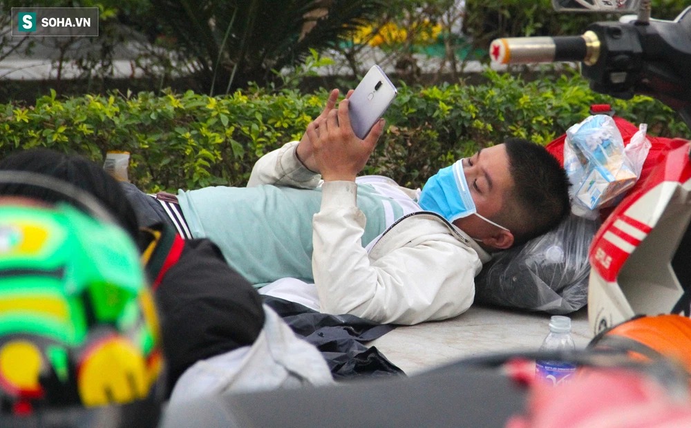 Người tranh thủ ngủ ở vỉa hè hay gục ngay trên chiếc xe máy. Người thì nằm vật vạ ở vỉa hè tranh thủ gọi điện thông báo tình hình cho người thân ở nhà đỡ lo lắng.
