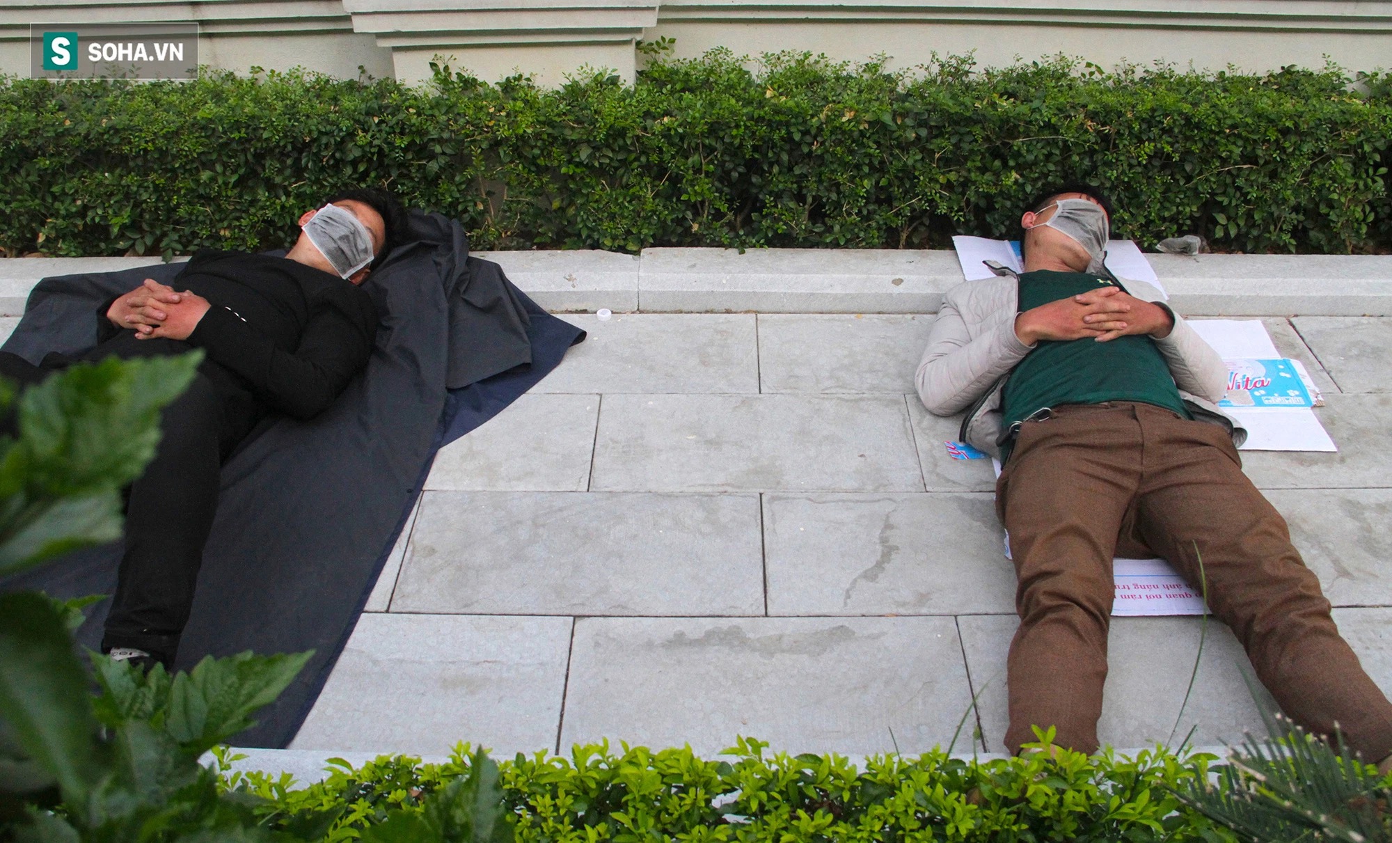 2 người đàn ông trải nilong và ít bìa giấy rồi dùng khẩu trang che mắt để tranh thủ thời gian ít ỏi ngủ ngay trên vỉa hè.