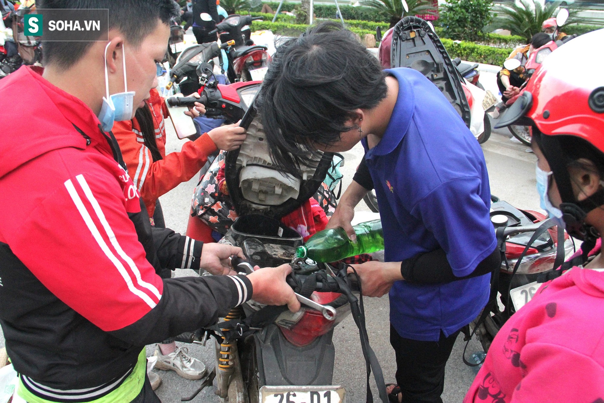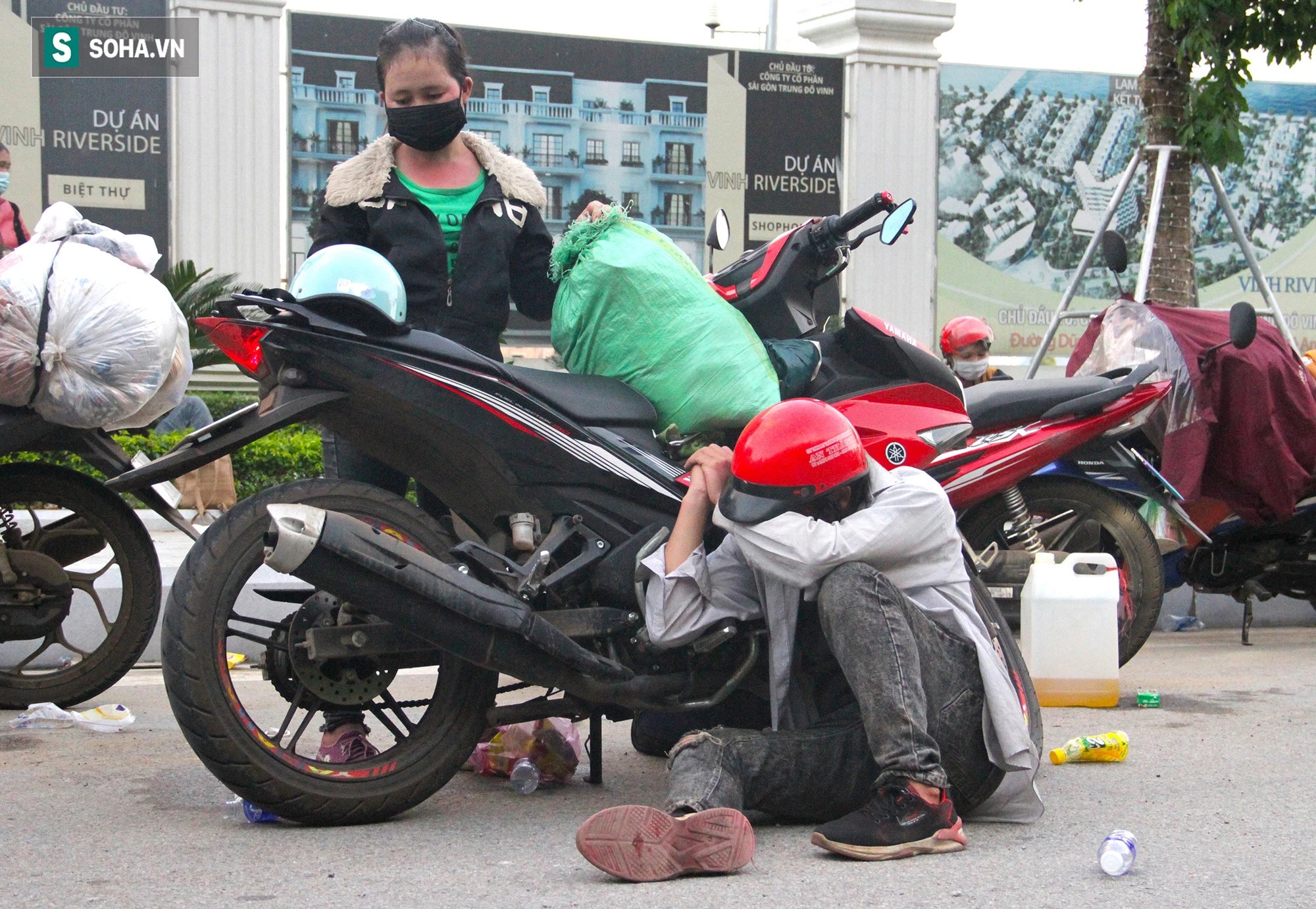Ai cũng mệt mỏi sau quãng đường xa. Nhiều người gục ngay bên chiếc xe máy của mình để nghỉ.