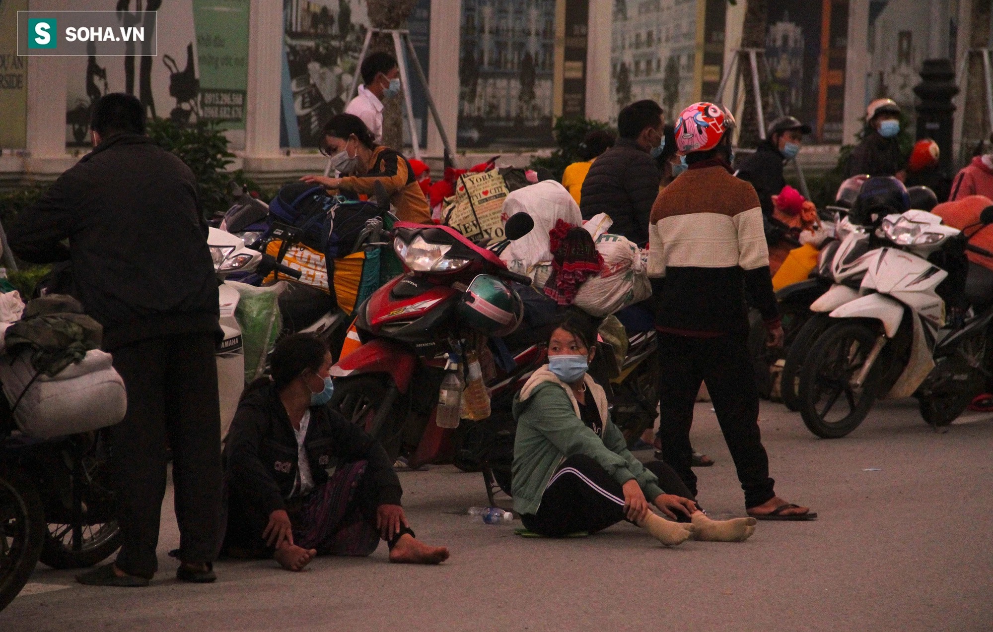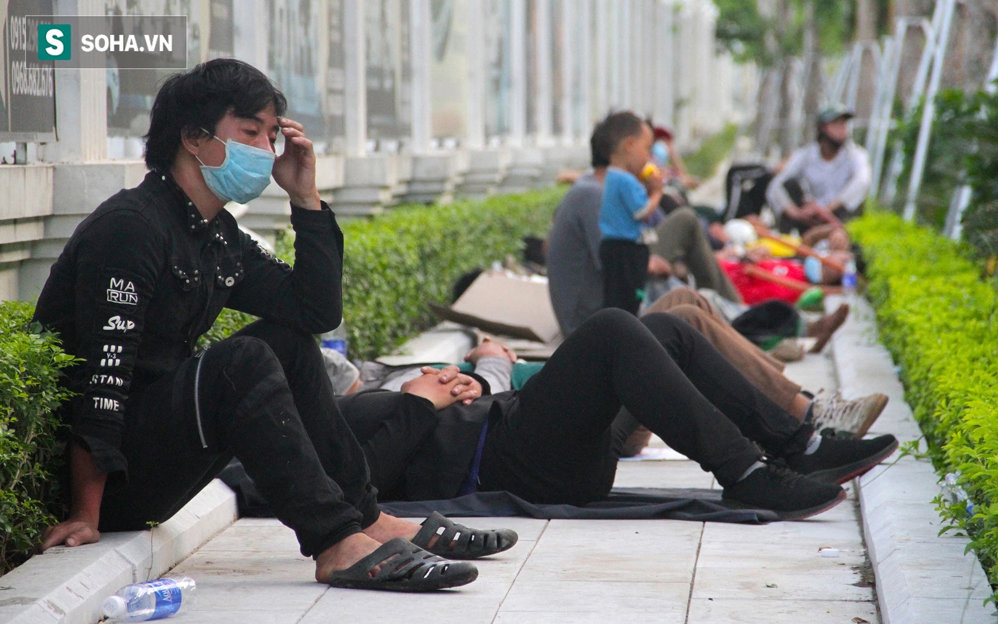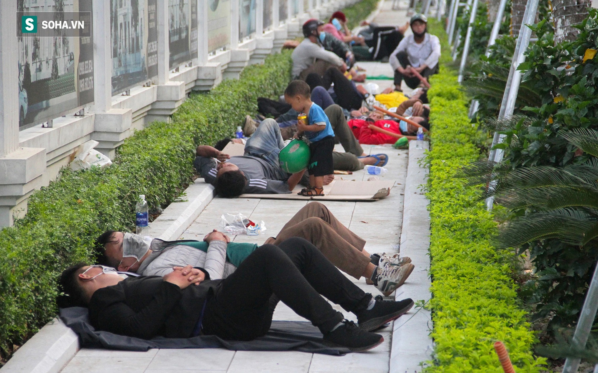 Cả dãy vỉa hè bên cạnh khu đô thị Vinh Reverside ven sông Lam Bến Thủy trở thành "giường" ngủ bất đắc dĩ cho từng đoàn người dân hồi hương.