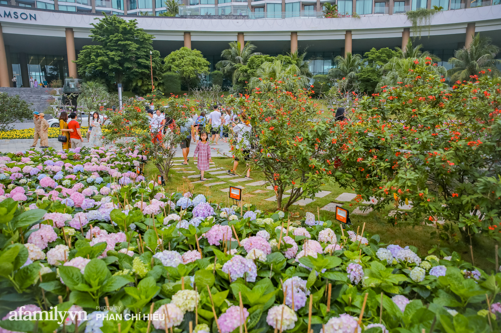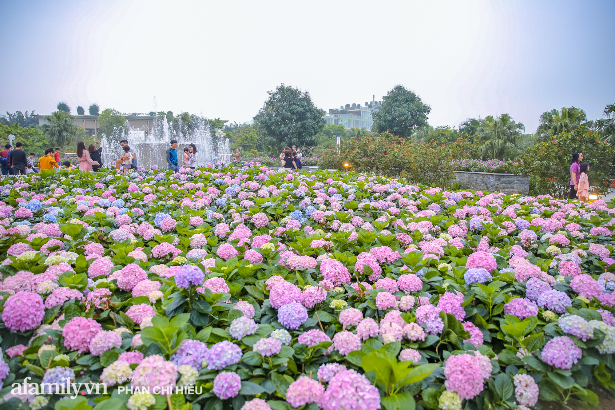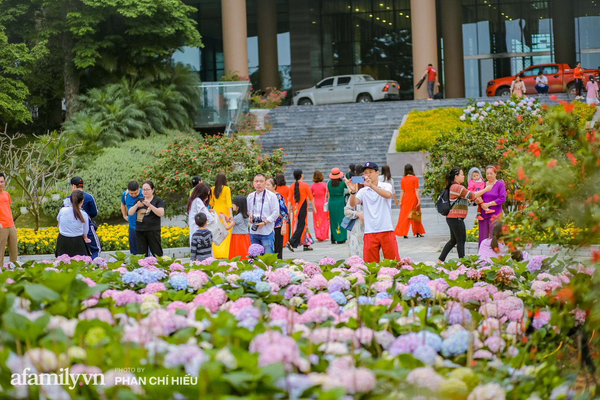 Cùng với cẩm tú cầu, hàng vạn bông hoa đang nở rộ trải dài hơn 1km từ cổng chào đến quảng trường Đông Tây, điểm thêm vẻ nên thơ cho khuôn viên quần thể vốn đã lộng lẫy sắc hoa. Chắc hẳn trong dịp cuối tuần người dân địa phương, du khách trong đó có các chị em đã có một nơi check-in "mỏi tay" với khung cách hoa với những concept tuyệt đẹp.