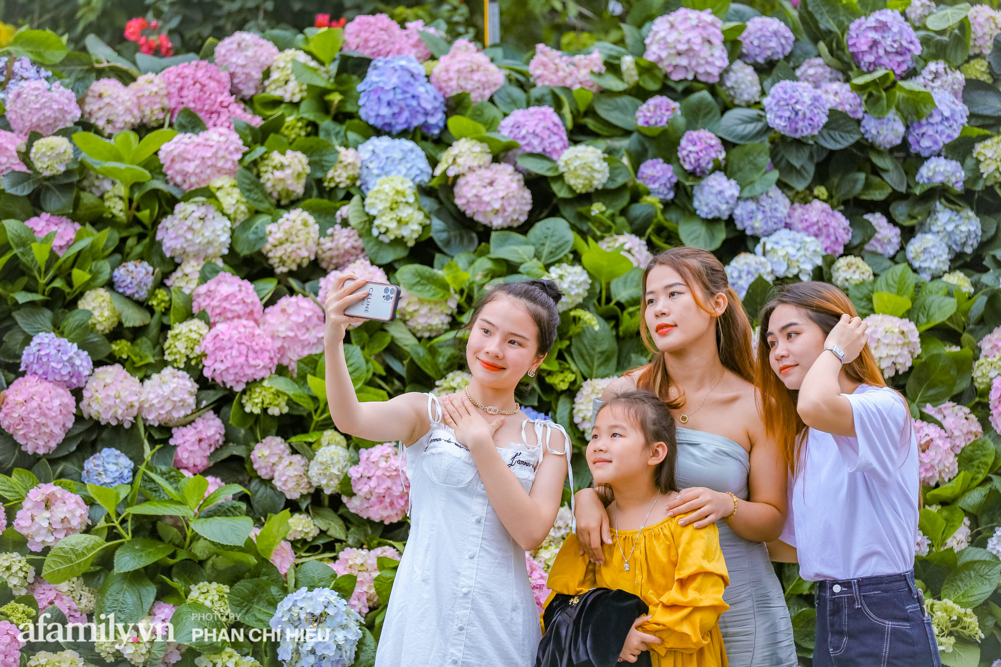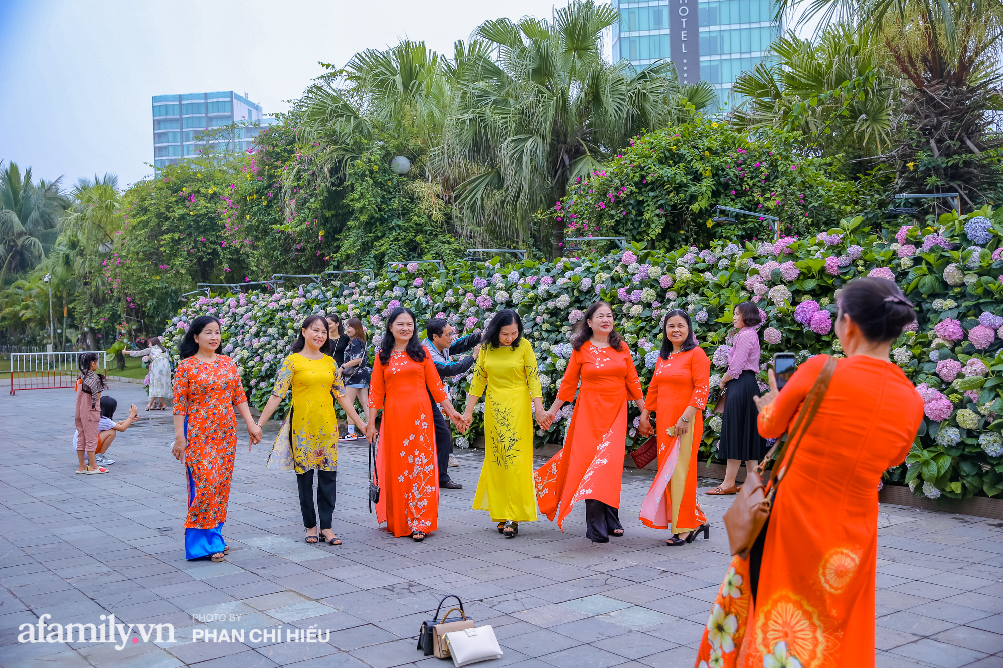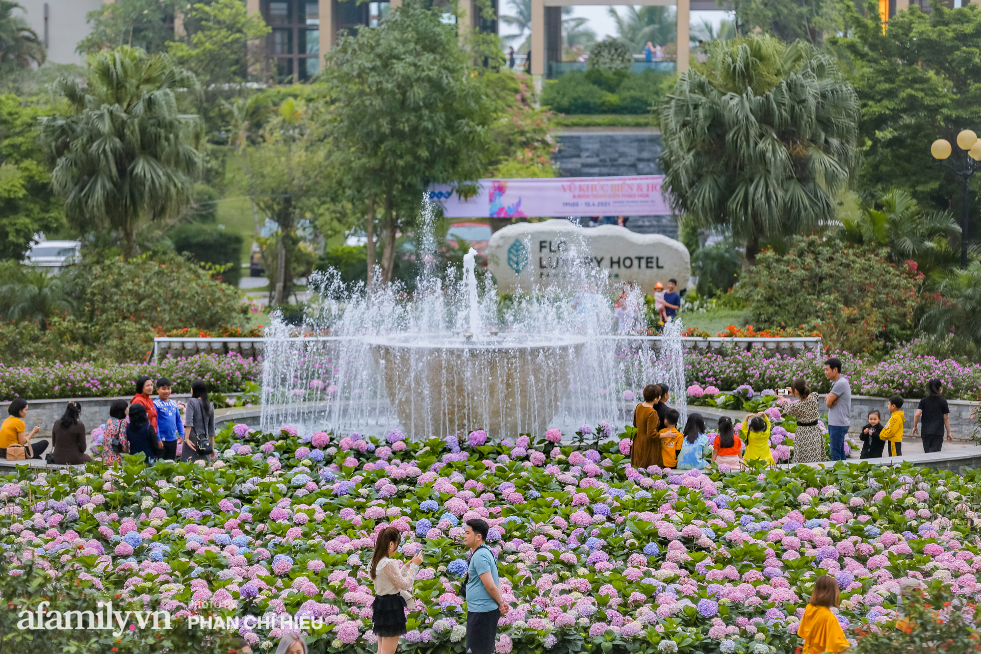 Cùng với cẩm tú cầu, hàng vạn bông hoa đang nở rộ trải dài hơn 1km từ cổng chào đến quảng trường Đông Tây, điểm thêm vẻ nên thơ cho khuôn viên quần thể vốn đã lộng lẫy sắc hoa. Chắc hẳn trong dịp cuối tuần người dân địa phương, du khách trong đó có các chị em đã có một nơi check-in "mỏi tay" với khung cách hoa với những concept tuyệt đẹp.