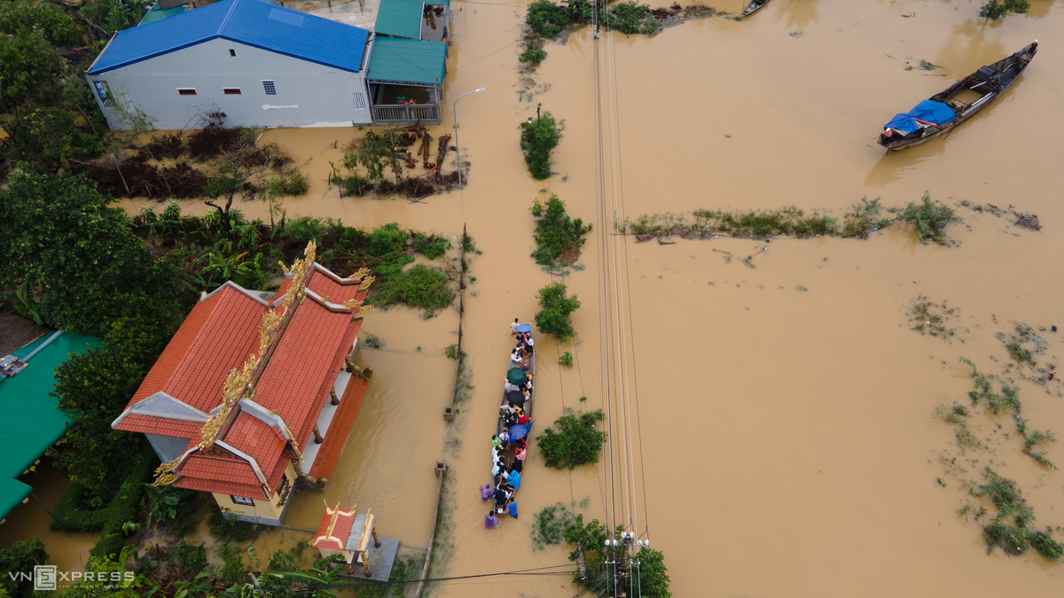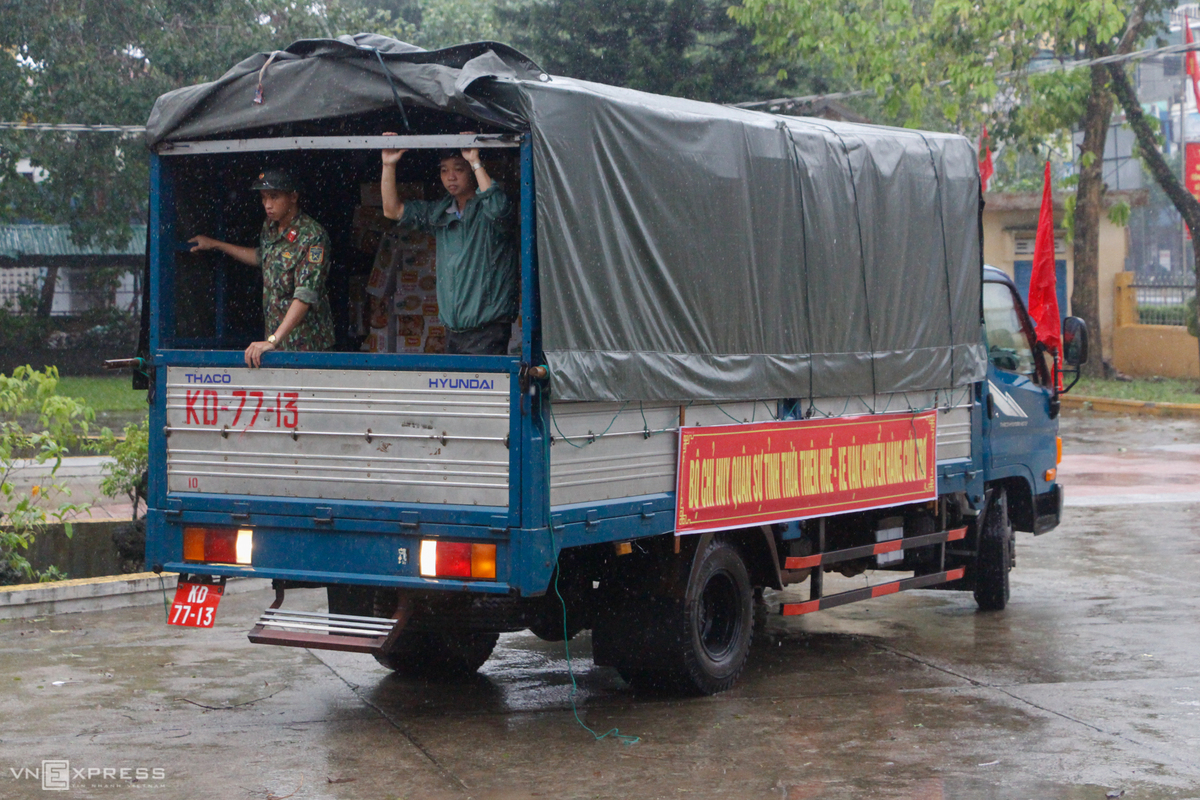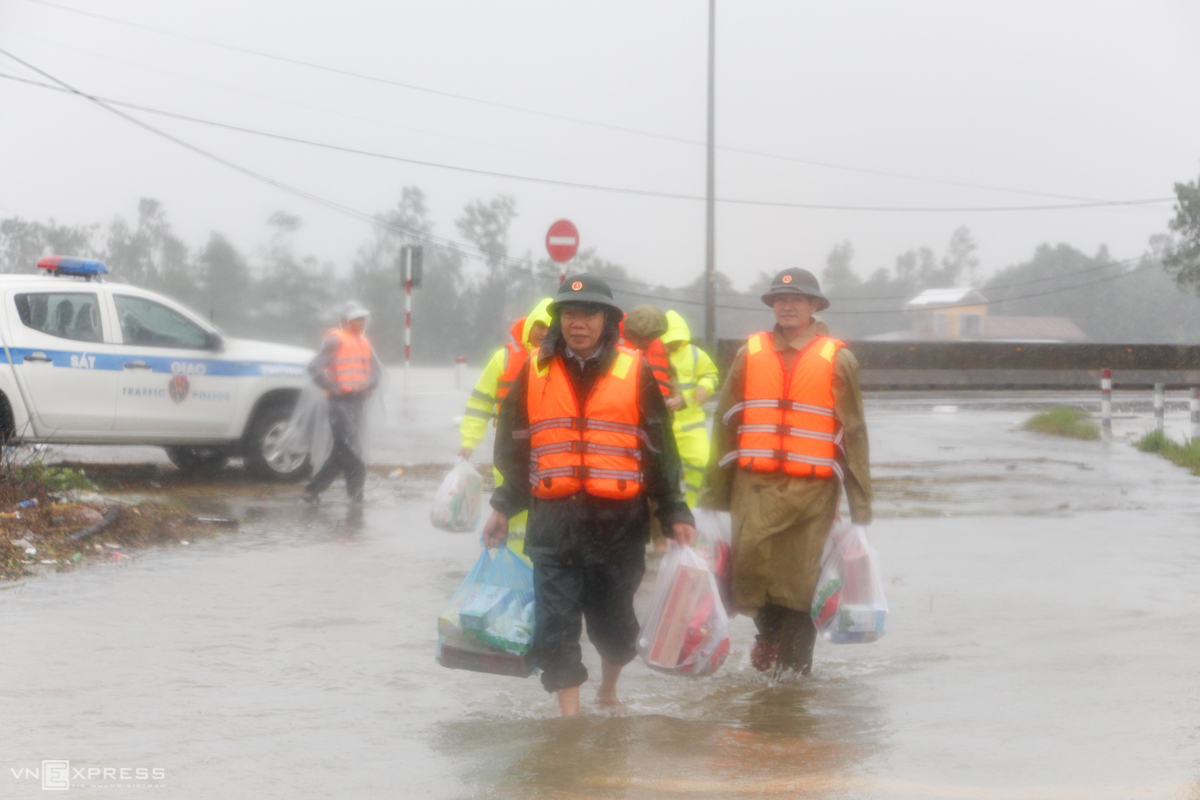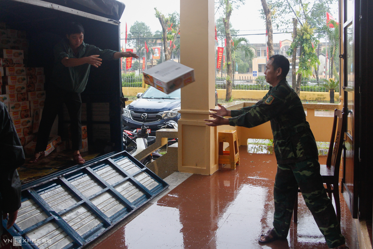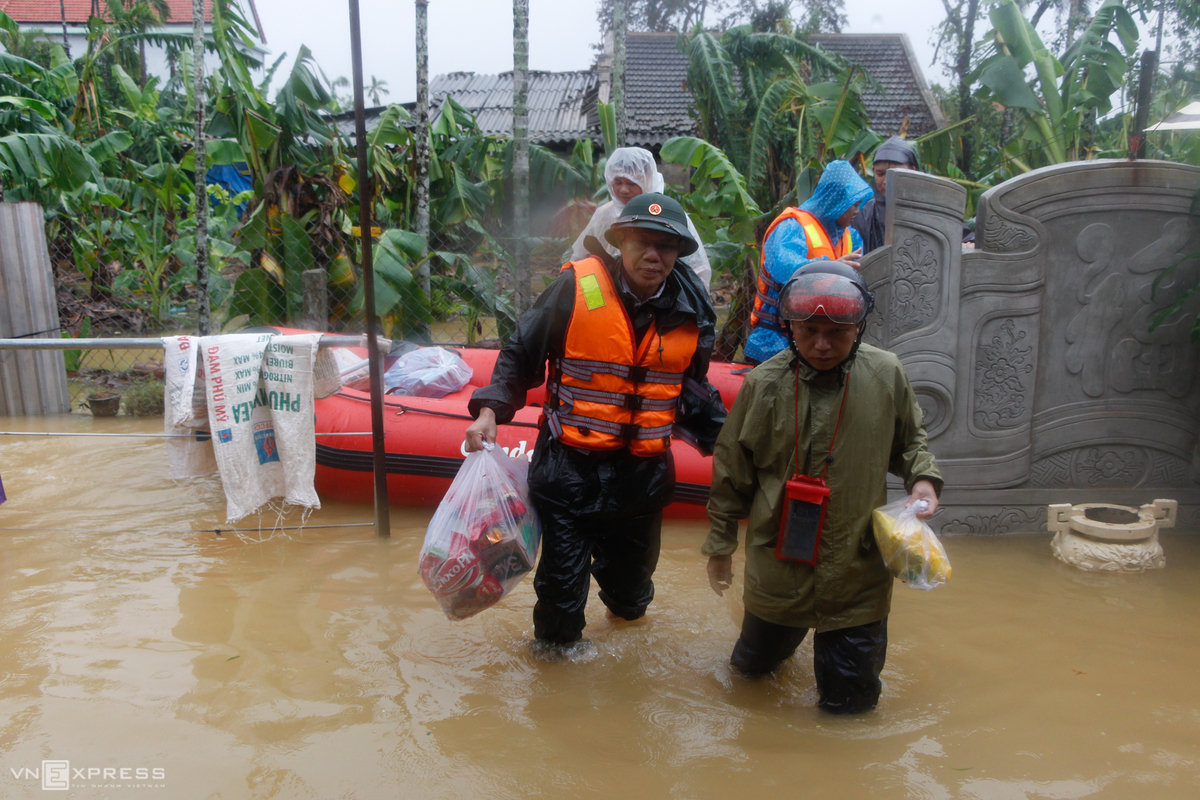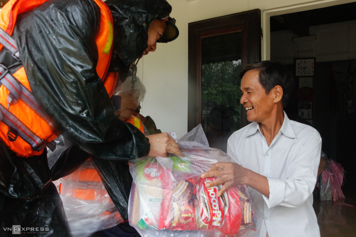Chiều 11/10, lãnh đạo UBND thị xã Hương Trà và lực lượng công an, quân đội mang theo mì tôm, bánh ngọt cứu trợ cho người dân bị mắc kẹt trong lũ ở phường Hương Văn, Tứ Hạ nằm bên sông Bồ.