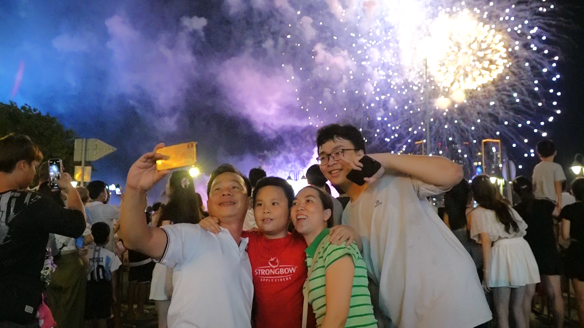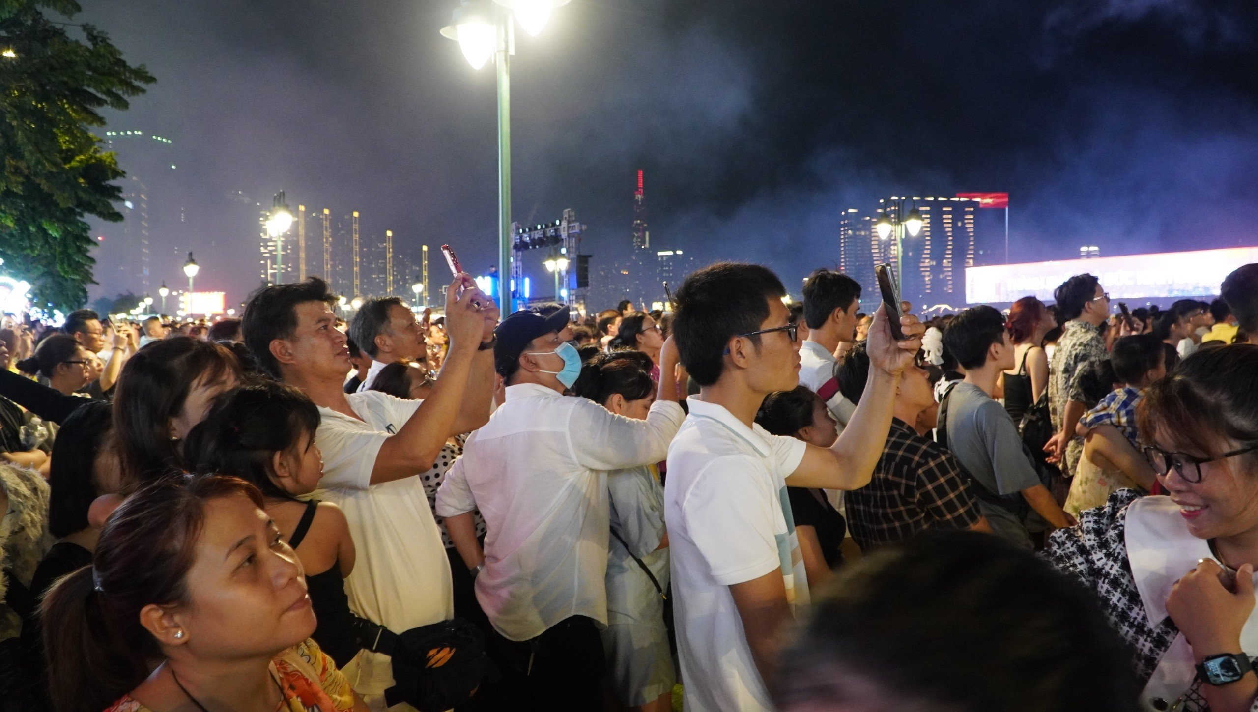 Từ sớm, người dân đã tìm đến các khu vực thuận lợi để dễ dàng ngắm trọn vẹn màn pháo hoa. Các khu vực như Công viên bến Bạch Đằng, Phố đi bộ Nguyễn Huệ chật kín người..