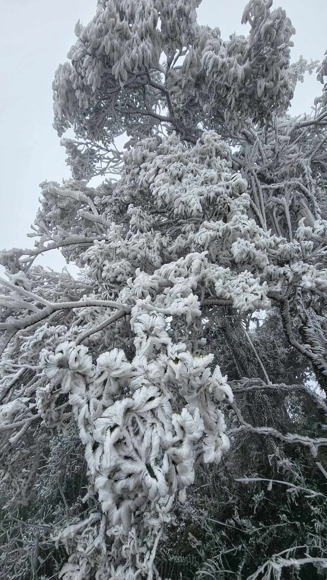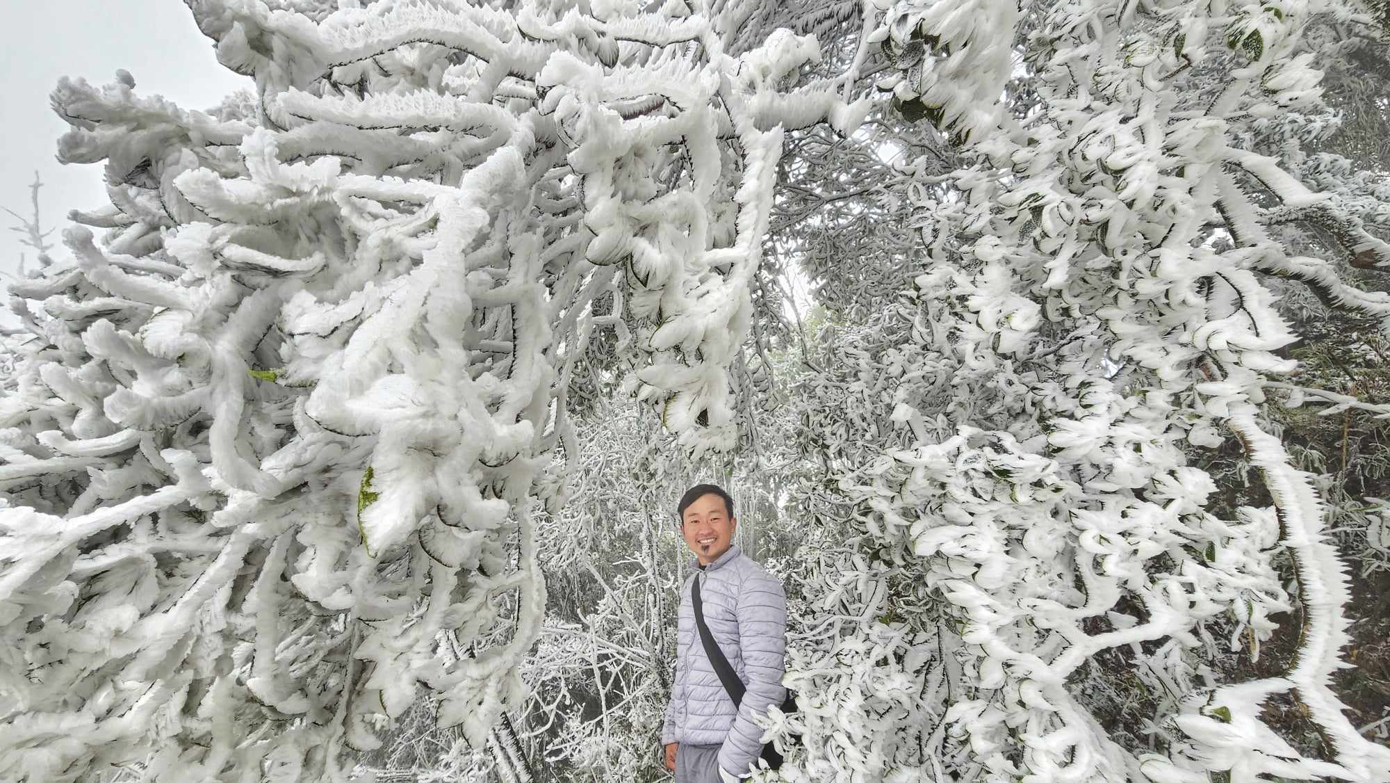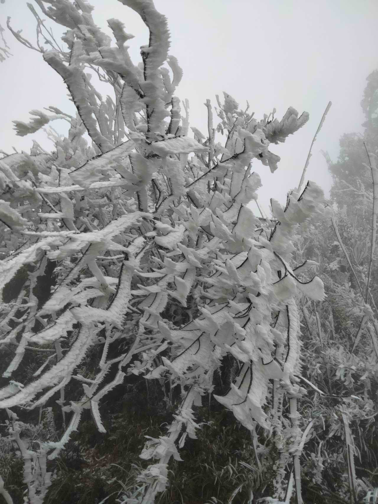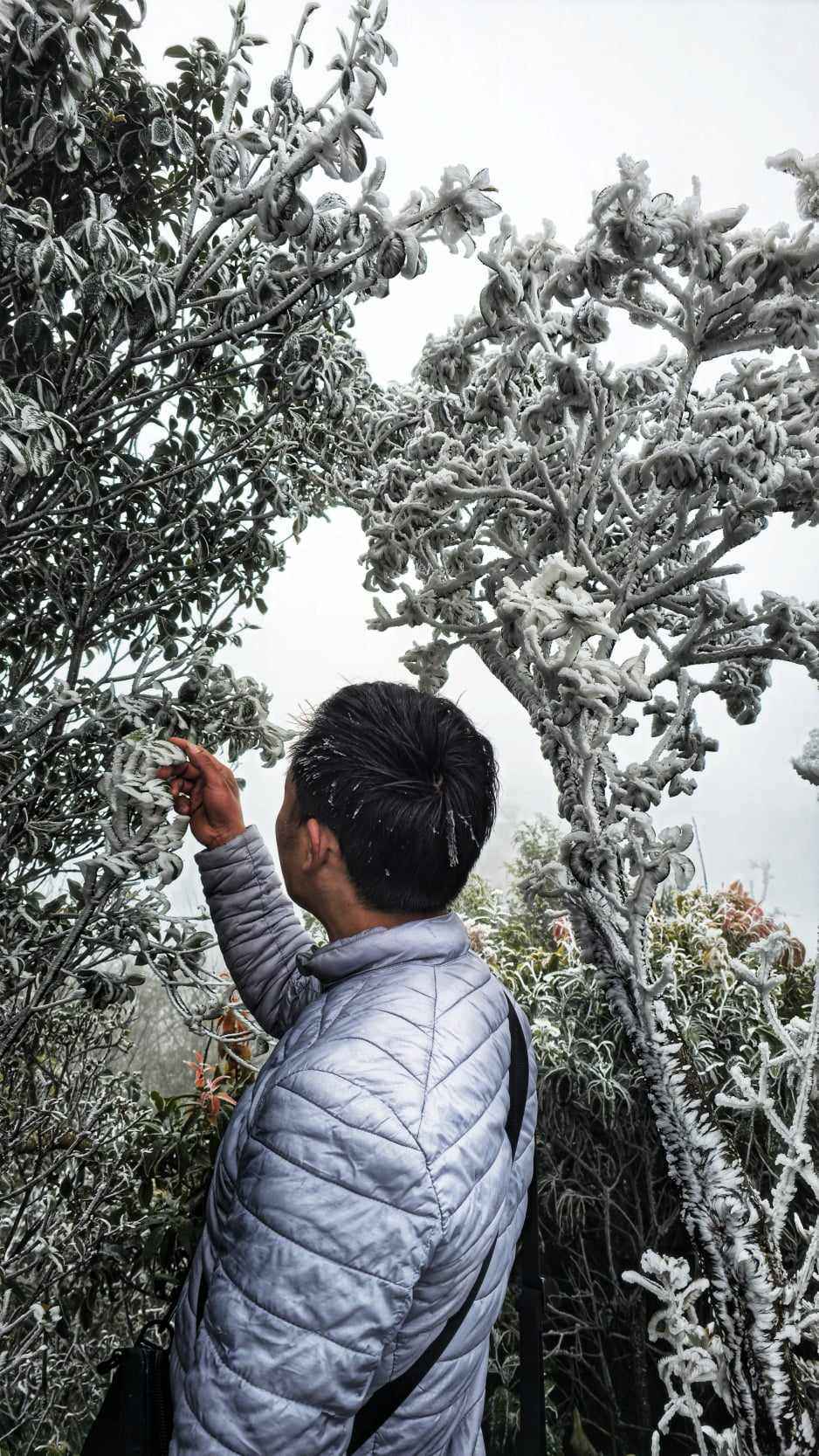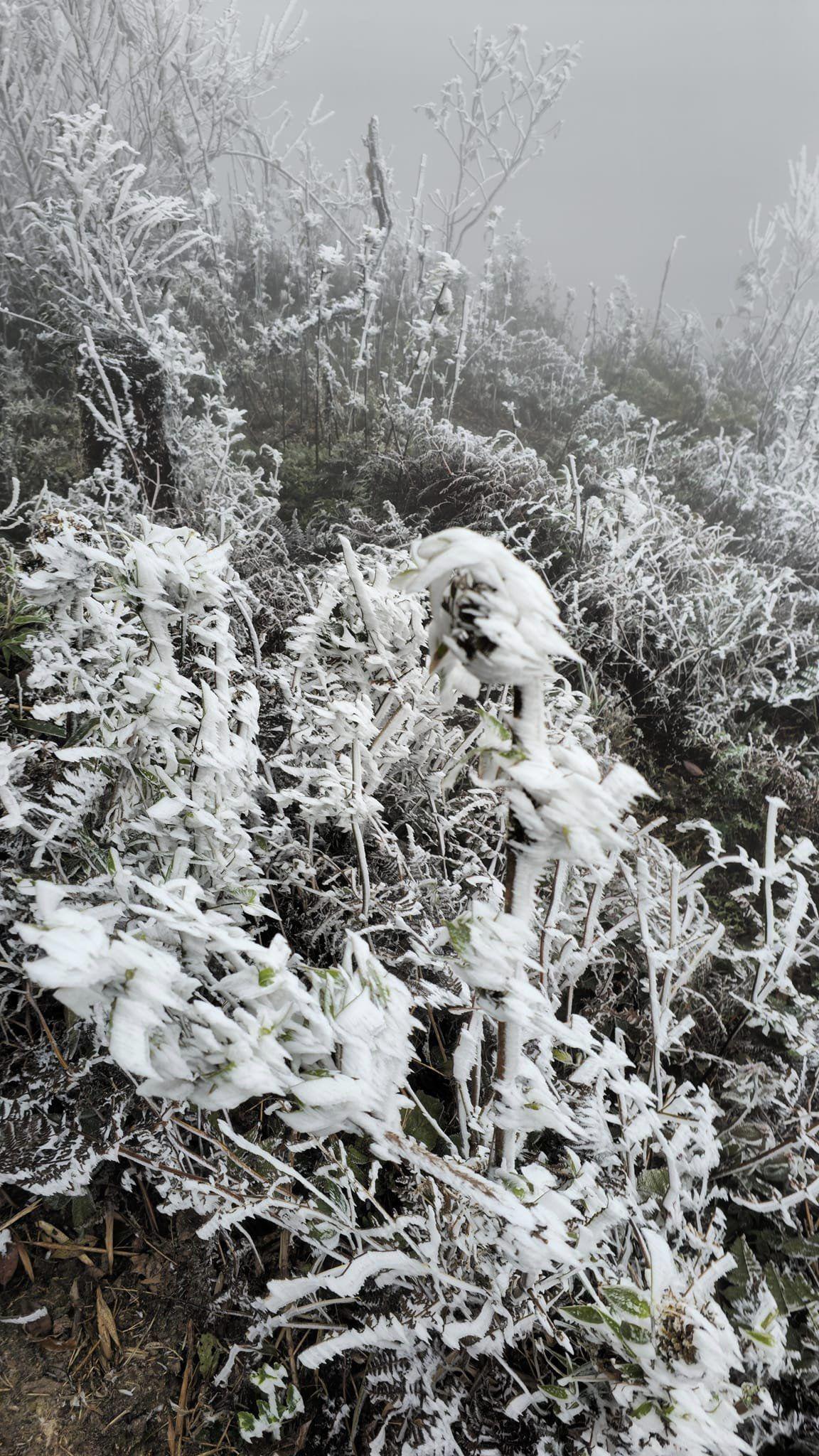 Một lớp băng giá xuất hiện phủ trắng xóa lên mọi cảnh vật trên đỉnh La Pán Tẩn (huyện Mù Căng Chải, Yên Bái).