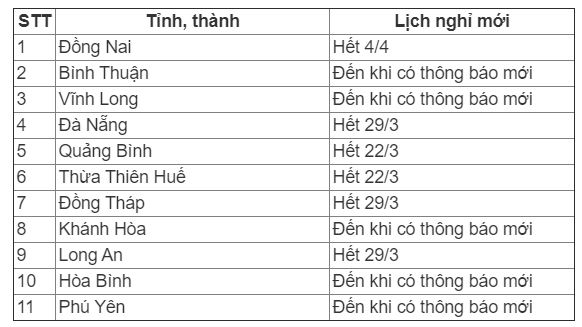 Ngày 10/3, Đồng Nai là tỉnh đầu tiên cho học sinh từ mầm non đến THCS nghỉ hết tháng 3 để phòng dịch. Sau đó hai ngày, Đà Nẵng cũng cho học sinh tất cả các cấp nghỉ hết 29/3.