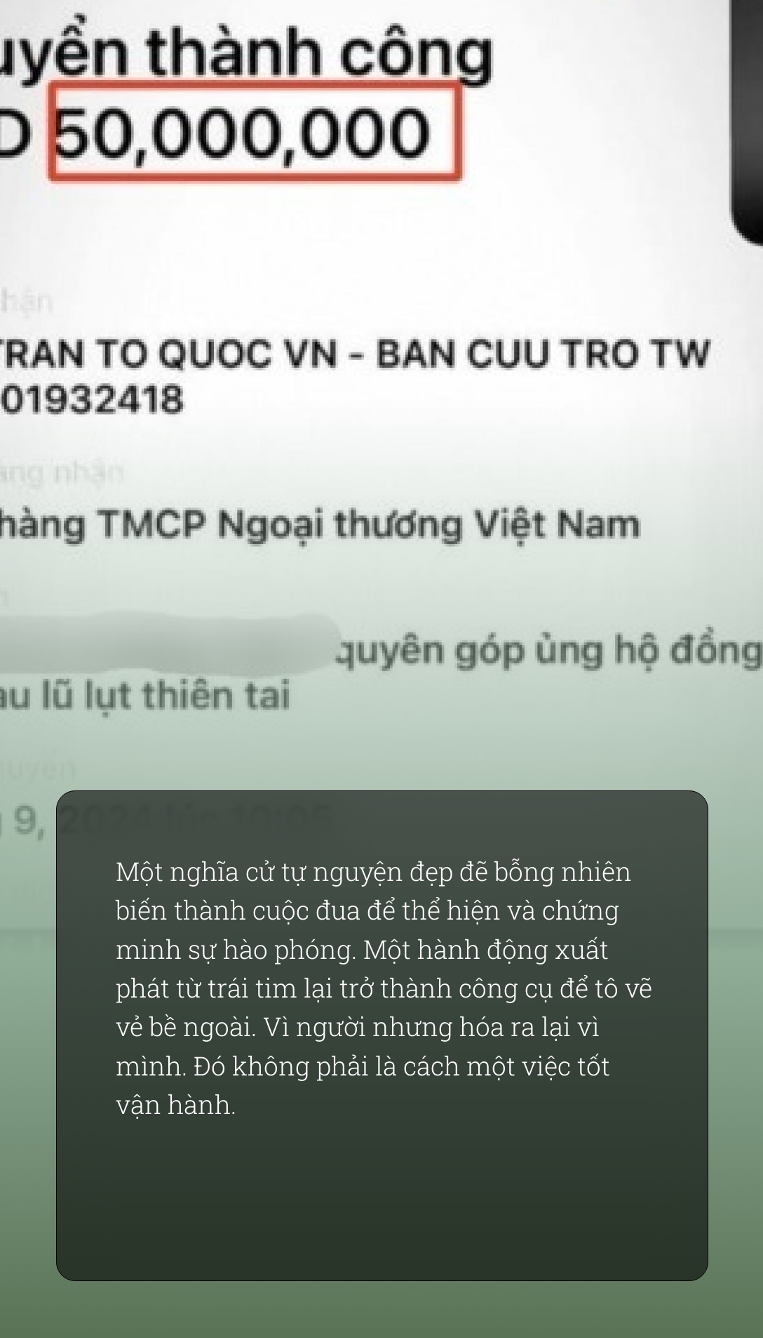 Một trong những nội dung được chia sẻ nhiều nhất kể từ khi đợt lũ quét bắt đầu hoành hành tại miền Bắc chính là những ảnh chụp màn hình chuyển khoản tới MTTQ để ủng hộ cho đồng bào bão lũ. Những tấm hóa đơn tiền triệu, chục triệu, thậm chí trăm triệu được chia sẻ liên tục từ các KOL, người giàu, người có vẻ… không quá giàu - giống như một cú hích khiến cả cộng đồng được truyền cảm hứng cho đi.