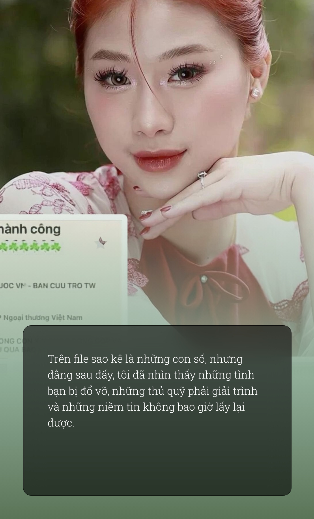 Nhưng 12 nghìn trang sao kê không chỉ kể câu chuyện về những kẻ phông bạt và gian dối, nó còn cho chúng ta thấy cuộc đời này vẫn còn thật nhiều những con người tốt bụng, tử tế và thật thà. Chúng ta không chỉ tìm thấy những lời nói dối ở những con số, mà còn thấy được cả niềm hy vọng và tình yêu thương.