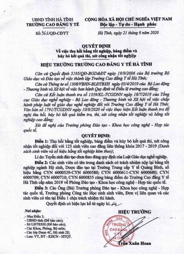 Sau đó, Trường Cao đẳng Y tế Hà Tĩnh ra quyết định thu hồi bằng tốt nghiệp đối với 125 học viên cao đẳng liên thông khóa 2017 - 2019 khiến các học viên vô cùng hoang mang.