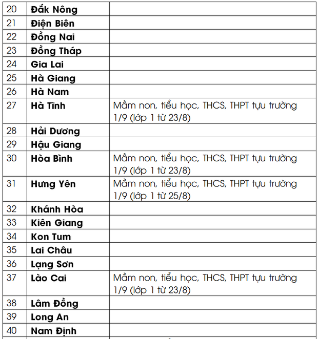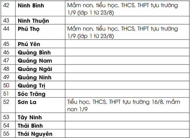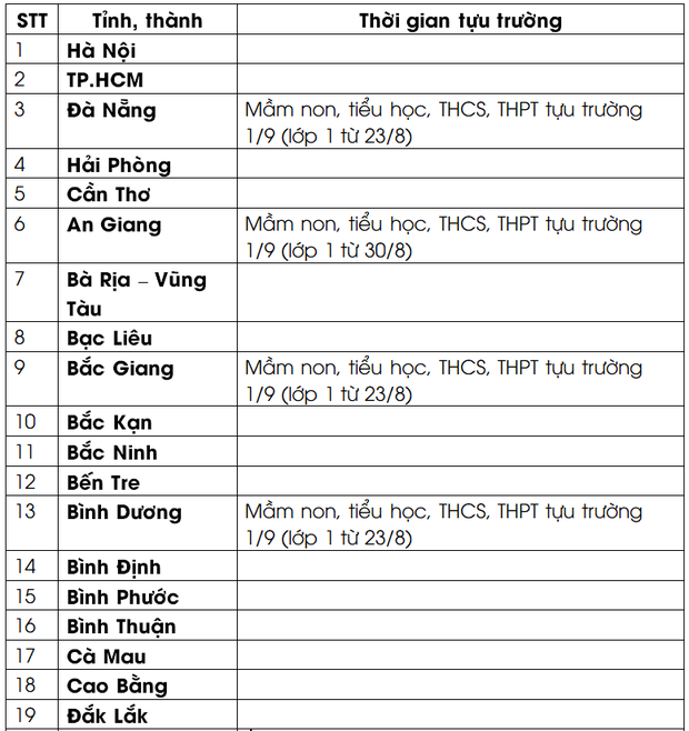 Cụ thể lịch đi học lại của các tỉnh thành như sau: