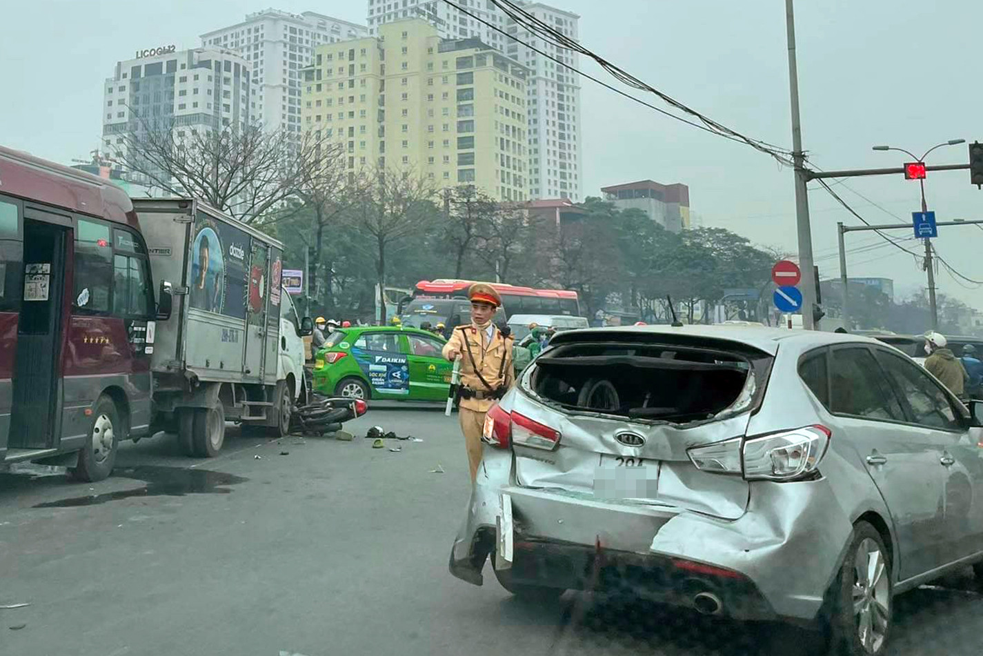 Thời điểm trên, 3 ô tô gồm một xe tải, một ô tô con cùng mang biển số Hà Nội, một xe khách biển số Ninh Bình và 2 xe máy đang lưu thông cùng chiều, hướng từ đường Giải Phóng vào trung tâm thành phố Hà Nội thì va chạm.